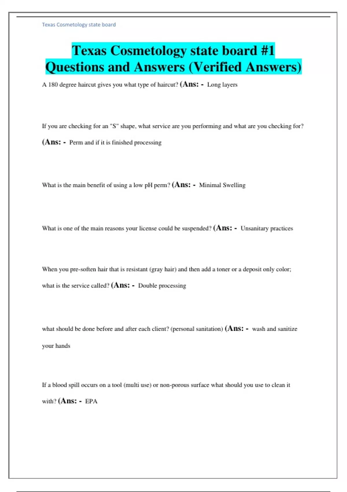 Texas Cosmetology state board #1 Questions and Answers (Verified Answers)