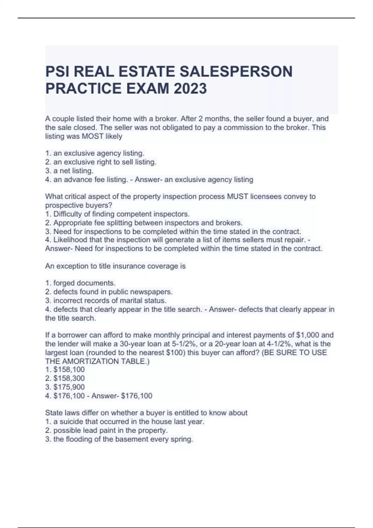PSI REAL ESTATE SALESPERSON PRACTICE EXAM 2023