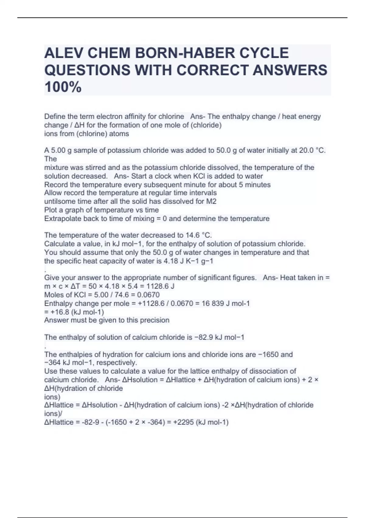 ALEV CHEM BORN-HABER CYCLE QUESTIONS WITH CORRECT ANSWERS 100%