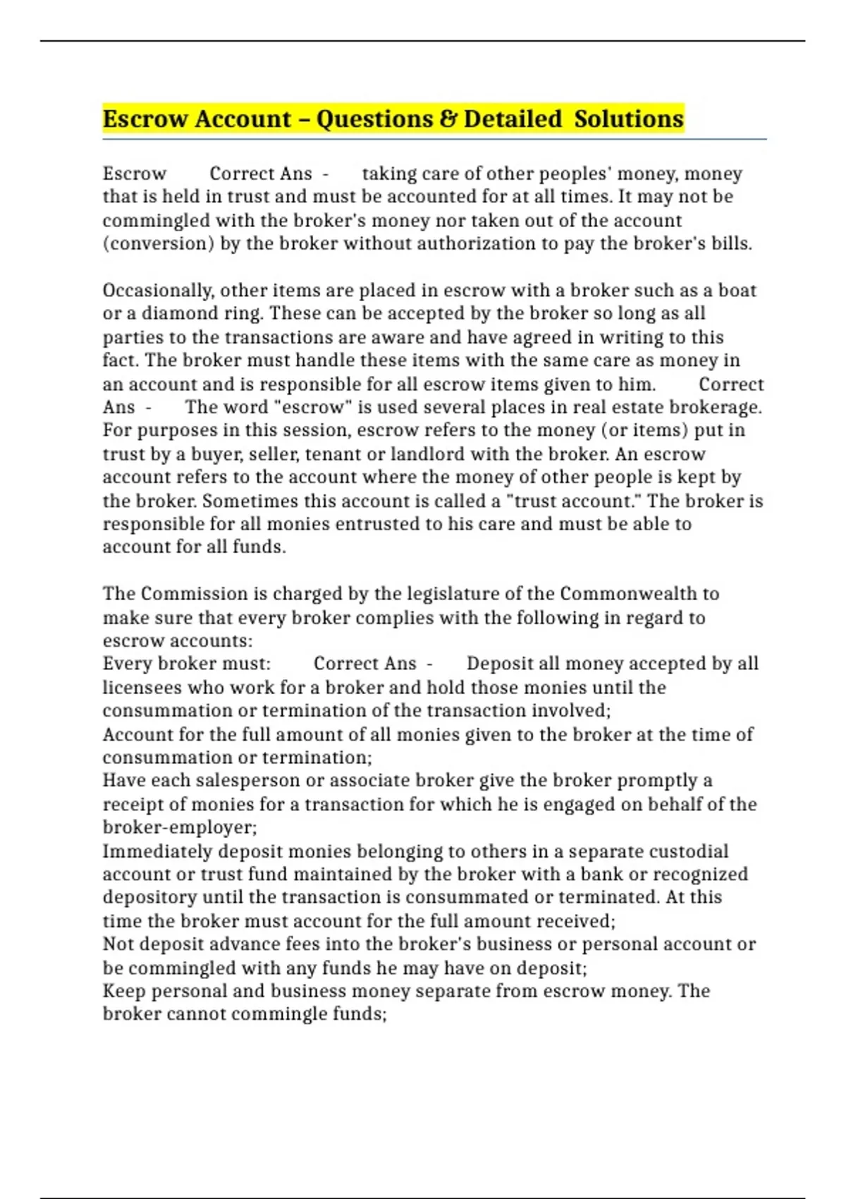Escrow Correct Ans - taking care of other peoples' money, money