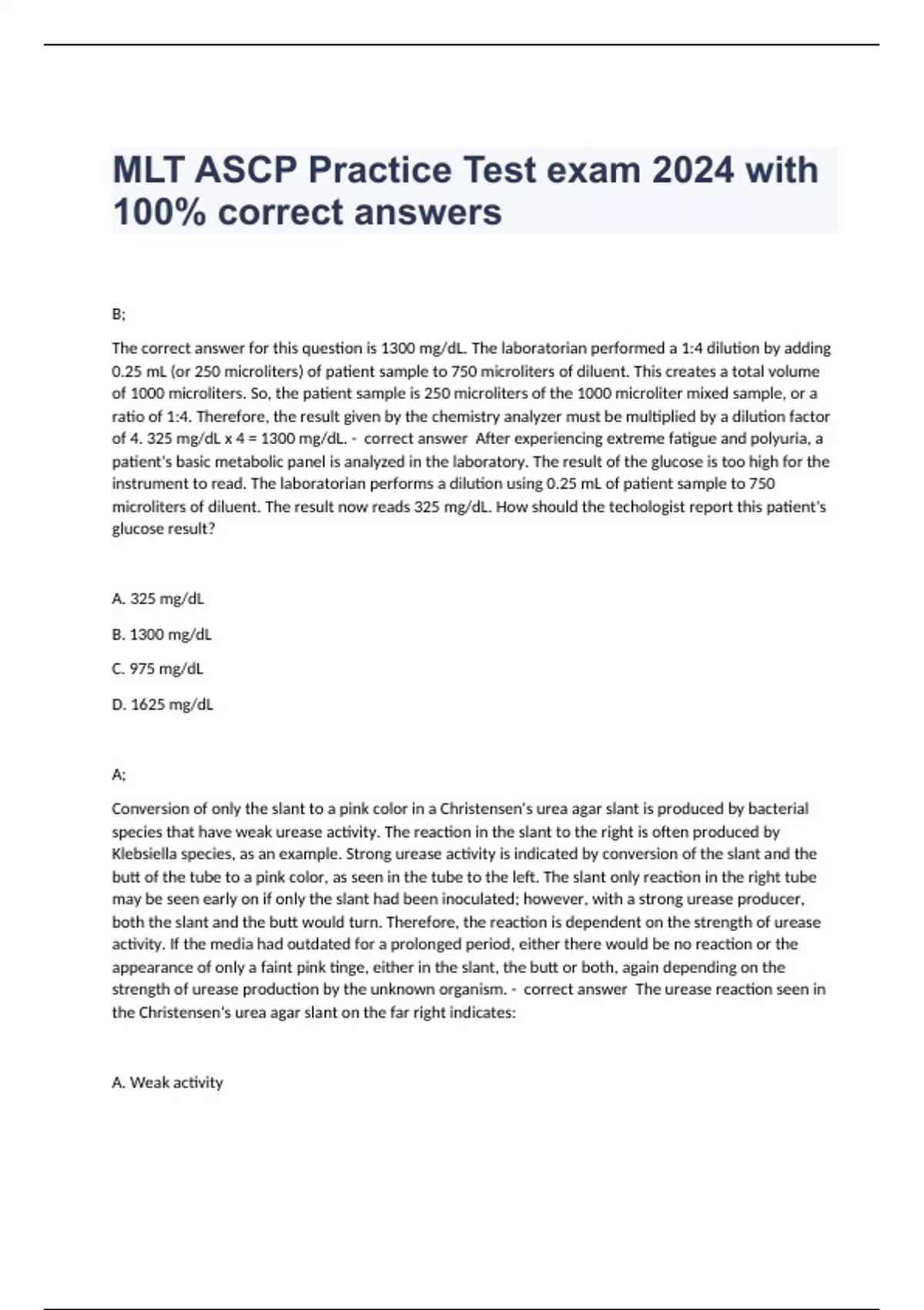 B; The correct answer for this question is 1300 mg/dL. The laboratorian performed a 1:4 dilution by adding 0.25 mL (or 250 microliters) of patient sample to 750 microliters of diluent. This creates a total volume of 1000 microliters. So, the patient sample is 250 microliters of the 1000 microliter mixed sample, or a ratio of 1:4. Therefore, the result given by the chemistry analyzer must be multiplied by a dilution factor of 4. 325 mg/dL x 4 = 1300 mg/dL. - correct answer After experiencing extreme fatigue and polyuria, a patient's basic metabolic panel is analyzed in the laboratory. The result of the glucose is too high for the instrument to read. The laboratorian performs a dilution using 0.25 mL of patient sample to 750 microliters of diluent. The result now reads 325 mg/dL. How should the techologist report this patient's glucose result? A. 325 mg/dL B. 1300 mg/dL C. 975 mg/dL D. 1625 mg/dL A; Conversion of only the slant to a pink color in a Christensen's urea agar slant is produced by bacterial species that have weak urease activity. The reaction in the slant to the right is often produced by Klebsiella species, as an example. Strong urease activity is indicated by conversion of the slant and the butt of the tube to a pink color, as seen in the tube to the left. The slant only reaction in the right tube may be seen early on if only the slant had been inoculated; however, with a strong urease producer, both the slant and the butt would turn. Therefore, the reaction is dependent on the strength of urease activity. If the media had outdated for a prolonged period, either there would be no reaction or the appearance of only a faint pink tinge, either in the slant, the butt or both, again depending on the strength of urease production by the unknown organism. - correct answer The urease reaction seen in the Christensen's urea agar slant on the far right indicates: A. Weak activity B. Strong activity C. Slant only inoculated D. Use of outdated medium D; The steps in the PCR process are: 1. Denaturatio