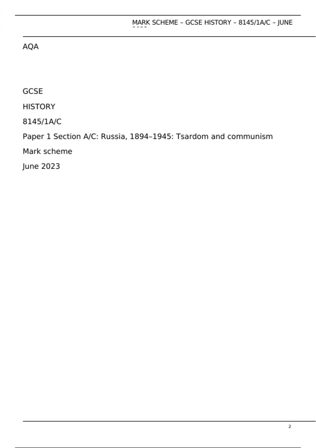 , MARK SCHEME – GCSE HISTORY – 8145/1A/C – JUNE