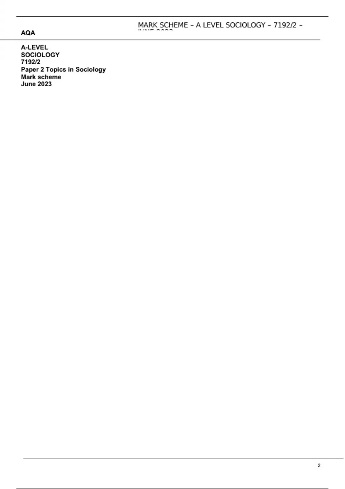 AQA A-LEVEL SOCIOLOGY 7192/2 Paper 2 Topics in Sociology Mark scheme June 2023