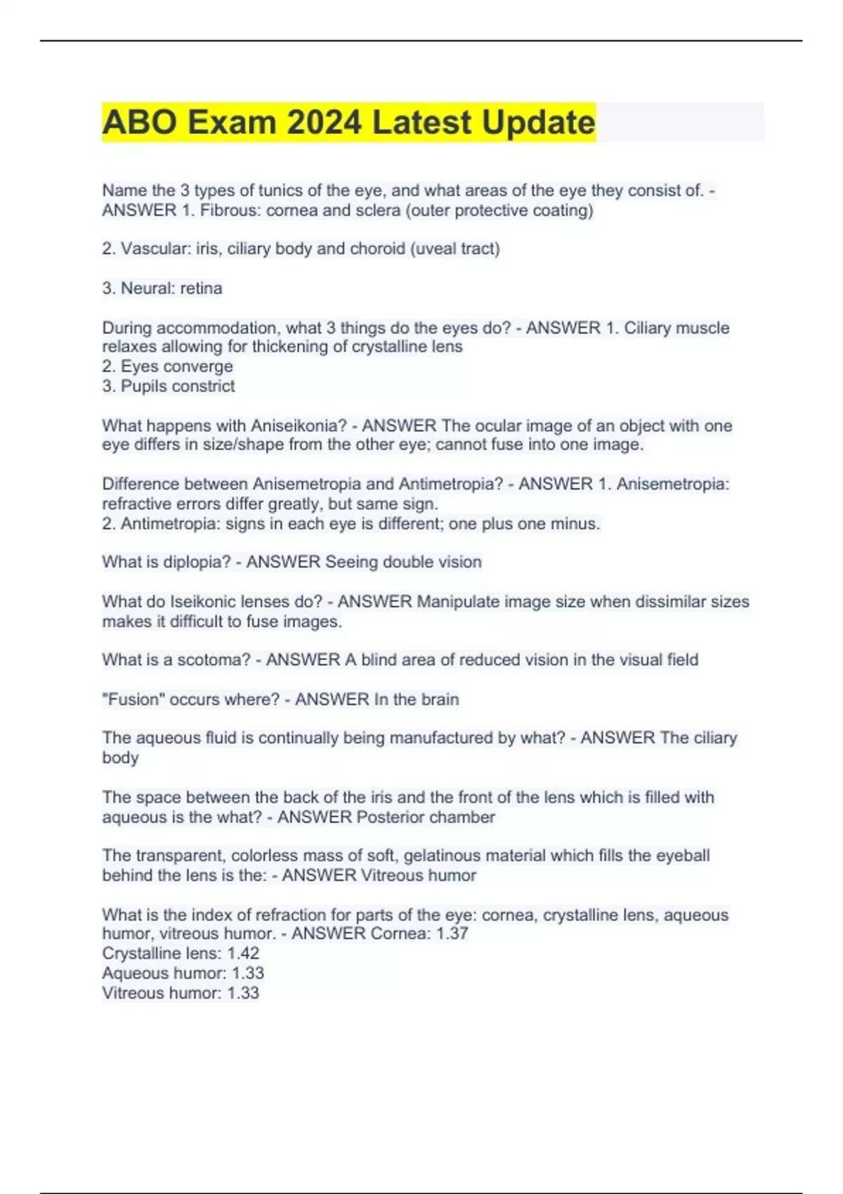 Name the 3 types of tunics of the eye, and what areas of the eye they consist of. - ANSWER 1. Fibrous: cornea and sclera (outer protective coating) 2. Vascular: iris, ciliary body and choroid (uveal tract) 3. Neural: retina During accommodation, what 3 things do the eyes do? - ANSWER 1. Ciliary muscle relaxes allowing for thickening of crystalline lens 2. Eyes converge 3. Pupils constrict What happens with Aniseikonia? - ANSWER The ocular image of an object with one eye differs in size/shape from the other eye; cannot fuse into one image. Difference between Anisemetropia and Antimetropia? - ANSWER 1. Anisemetropia: refractive errors differ greatly, but same sign. 2. Antimetropia: signs in each eye is different; one plus one minus. What is diplopia? - ANSWER Seeing double vision What do Iseikonic lenses do? - ANSWER Manipulate image size when dissimilar sizes makes it difficult to fuse images. What is a scotoma? - ANSWER A blind area of reduced vision in the visual field "Fusion" occurs where? - ANSWER In the brain The aqueous fluid is continually being manufactured by what? - ANSWER The ciliary body