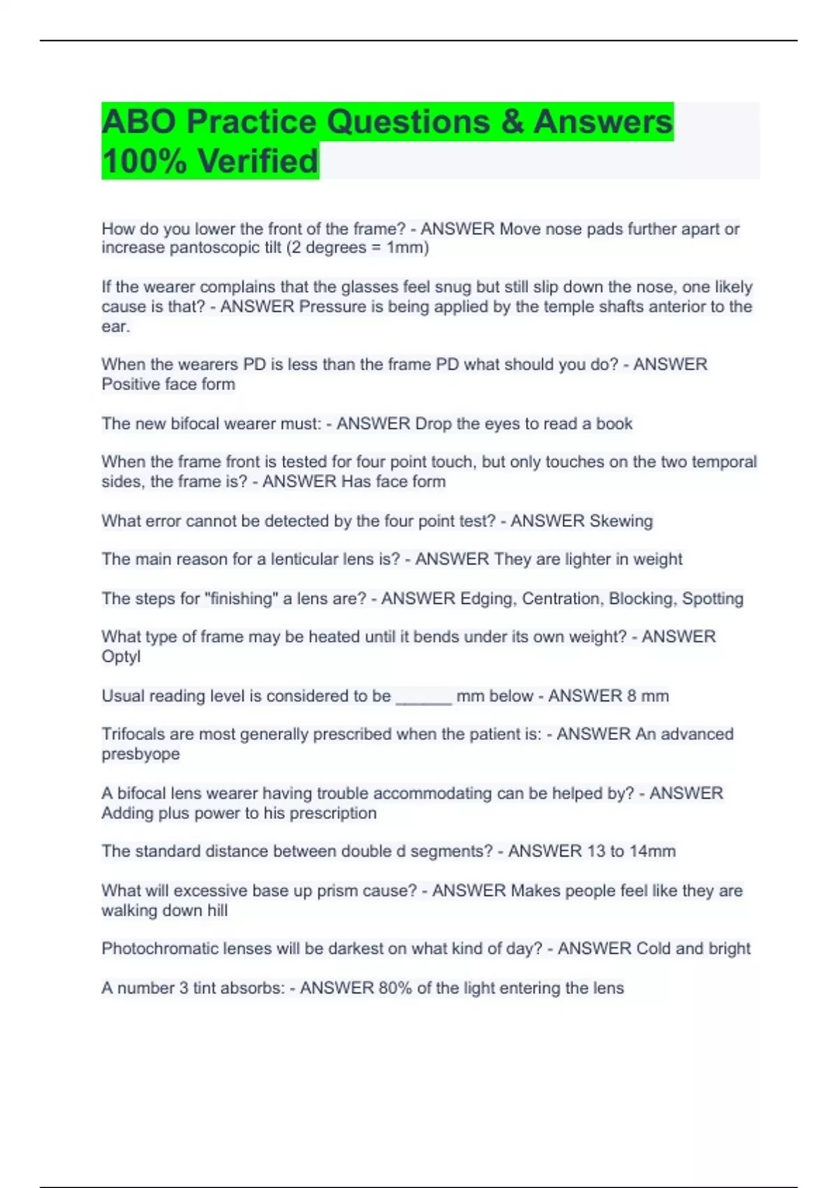 How do you lower the front of the frame? - ANSWER Move nose pads further apart or increase pantoscopic tilt (2 degrees = 1mm) If the wearer complains that the glasses feel snug but still slip down the nose, one likely cause is that? - ANSWER Pressure is being applied by the temple shafts anterior to the ear. When the wearers PD is less than the frame PD what should you do? - ANSWER Positive face form The new bifocal wearer must: - ANSWER Drop the eyes to read a book When the frame front is tested for four point touch, but only touches on the two temporal sides, the frame is? - ANSWER Has face form What error cannot be detected by the four point test? - ANSWER Skewing The main reason for a lenticular lens is? - ANSWER They are lighter in weight The steps for "finishing" a lens are? - ANSWER Edging, Centration, Blocking, Spotting What type of frame may be heated until it bends under its own weight? - ANSWER Optyl
