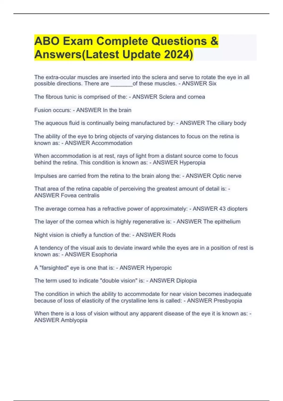 The extra-ocular muscles are inserted into the sclera and serve to rotate the eye in all possible directions. There are _______of these muscles. - ANSWER Six The fibrous tunic is comprised of the: - ANSWER Sclera and cornea Fusion occurs: - ANSWER In the brain The aqueous fluid is continually being manufactured by: - ANSWER The ciliary body The ability of the eye to bring objects of varying distances to focus on the retina is known as: - ANSWER Accommodation When accommodation is at rest, rays of light from a distant source come to focus behind the retina. This condition is known as: - ANSWER Hyperopia Impulses are carried from the retina to the brain along the: - ANSWER Optic nerve That area of the retina capable of perceiving the greatest amount of detail is: - ANSWER Fovea centralis The average cornea has a refractive power of approximately: - ANSWER 43 diopters The layer of the cornea which is highly regenerative is: - ANSWER The epithelium Night vision is chiefly a function of the: - ANSWER Rods A tendency of the visual axis to deviate inward while the eyes are in a position of rest is known as: - ANSWER Esophoria A "farsighted" eye is one that is: - ANSWER Hyperopic The term used to indicate "double vision" is: - ANSWER Diplopia