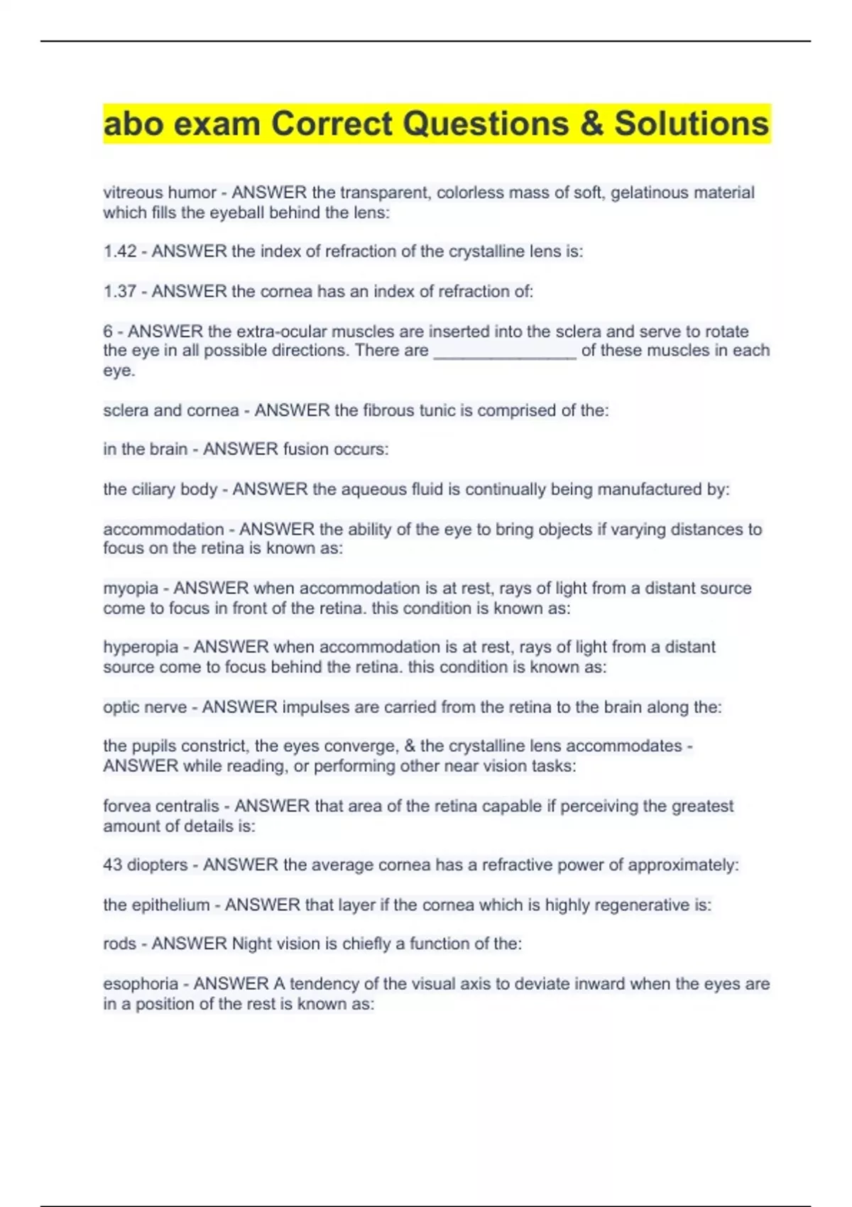 vitreous humor - ANSWER the transparent, colorless mass of soft, gelatinous material which fills the eyeball behind the lens: 1.42 - ANSWER the index of refraction of the crystalline lens is: 1.37 - ANSWER the cornea has an index of refraction of: 6 - ANSWER the extra-ocular muscles are inserted into the sclera and serve to rotate the eye in all possible directions. There are _______________ of these muscles in each eye. sclera and cornea - ANSWER the fibrous tunic is comprised of the: in the brain - ANSWER fusion occurs: the ciliary body - ANSWER the aqueous fluid is continually being manufactured by: accommodation - ANSWER the ability of the eye to bring objects if varying distances to focus on the retina is known as: myopia - ANSWER when accommodation is at rest, rays of light from a distant source come to focus in front of the retina. this condition is known as: hyperopia - ANSWER when accommodation is at rest, rays of light from a distant source come to focus behind the retina. this condition is known as: optic nerve - ANSWER impulses are carried from the retina to the brain along the: the pupils constrict, the eyes converge, & the crystalline lens accommodates - ANSWER while reading, or performing other near vision tasks: forvea centralis - ANSWER that area of the retina capable if perceiving the greatest amount of details is: