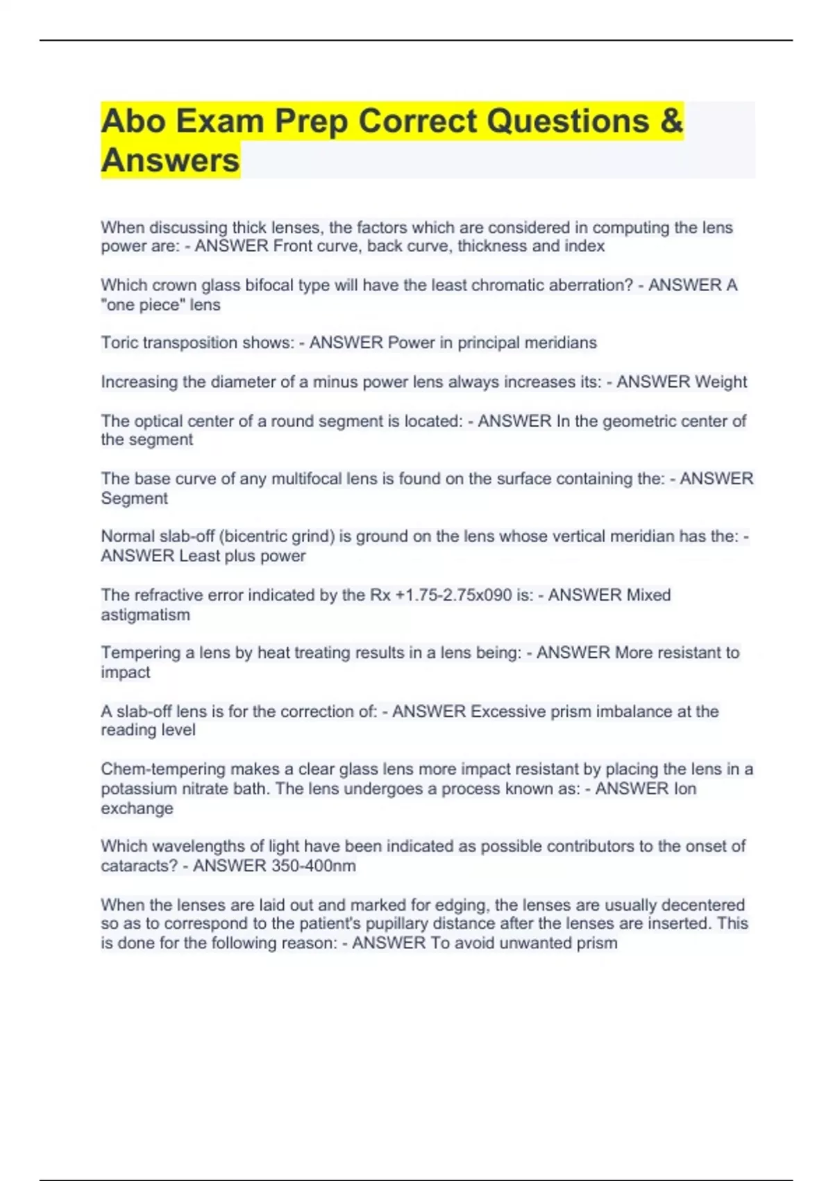 When discussing thick lenses, the factors which are considered in computing the lens power are: - ANSWER Front curve, back curve, thickness and index Which crown glass bifocal type will have the least chromatic aberration? - ANSWER A "one piece" lens Toric transposition shows: - ANSWER Power in principal meridians Increasing the diameter of a minus power lens always increases its: - ANSWER Weight The optical center of a round segment is located: - ANSWER In the geometric center of the segment The base curve of any multifocal lens is found on the surface containing the: - ANSWER Segment Normal slab-off (bicentric grind) is ground on the lens whose vertical meridian has the: - ANSWER Least plus power The refractive error indicated by the Rx +1.75-2.75x090 is: - ANSWER Mixed astigmatism Tempering a lens by heat treating results in a lens being: - ANSWER More resistant to impact A slab-off lens is for the correction of: - ANSWER Excessive prism imbalance at the reading level Chem-tempering makes a clear glass lens more impact resistant by placing the lens in a potassium nitrate bath. The lens undergoes a process known as: - ANSWER Ion exchange Which wavelengths of light have been indicated as possible contributors