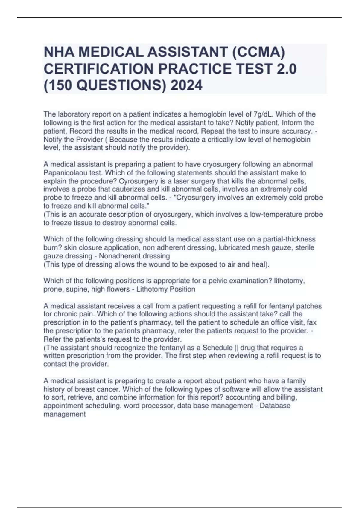 NHA MEDICAL ASSISTANT (CCMA) CERTIFICATION PRACTICE TEST 2.0 (150 QUESTIONS) 2024