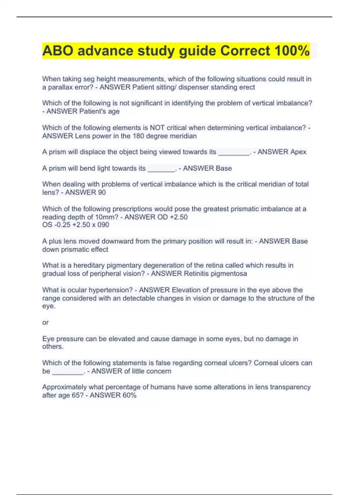 When taking seg height measurements, which of the following situations could result in a parallax error? - ANSWER Patient sitting/ dispenser standing erect Which of the following is not significant in identifying the problem of vertical imbalance? - ANSWER Patient's age Which of the following elements is NOT critical when determining vertical imbalance? - ANSWER Lens power in the 180 degree meridian A prism will displace the object being viewed towards its ________. - ANSWER Apex A prism will bend light towards its _______. - ANSWER Base When dealing with problems of vertical imbalance which is the critical meridian of total lens? - ANSWER 90 Which of the following prescriptions would pose the greatest prismatic imbalance at a reading depth of 10mm? - ANSWER OD +2.50 OS -0.25 +2.50 x 090 A plus lens moved downward from the primary position will result in: - ANSWER Base down prismatic effect What is a hereditary pigmentary degeneration of the retina called which results in gradual loss of peripheral vision? - ANSWER Retinitis pigmentosa What is ocular hypertension? - ANSWER Elevation of pressure in the eye above the range considered with an detectable changes in vision or damage to the structure of the eye. or Eye pressure can be elevated and cause damage in some eyes, but no damage in others. Which of the following statements is false regarding corneal ulcers? Corneal ulcers can be ________. - ANSWER of little concern Approximately what percentage of humans have some alterations in lens tra