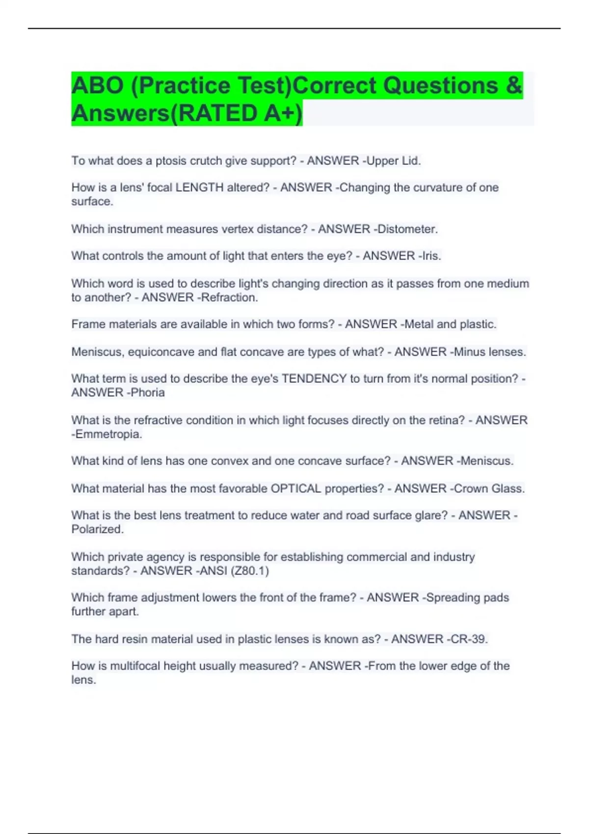 ABO (Practice Test)Correct Questions & Answers(RATED A+)