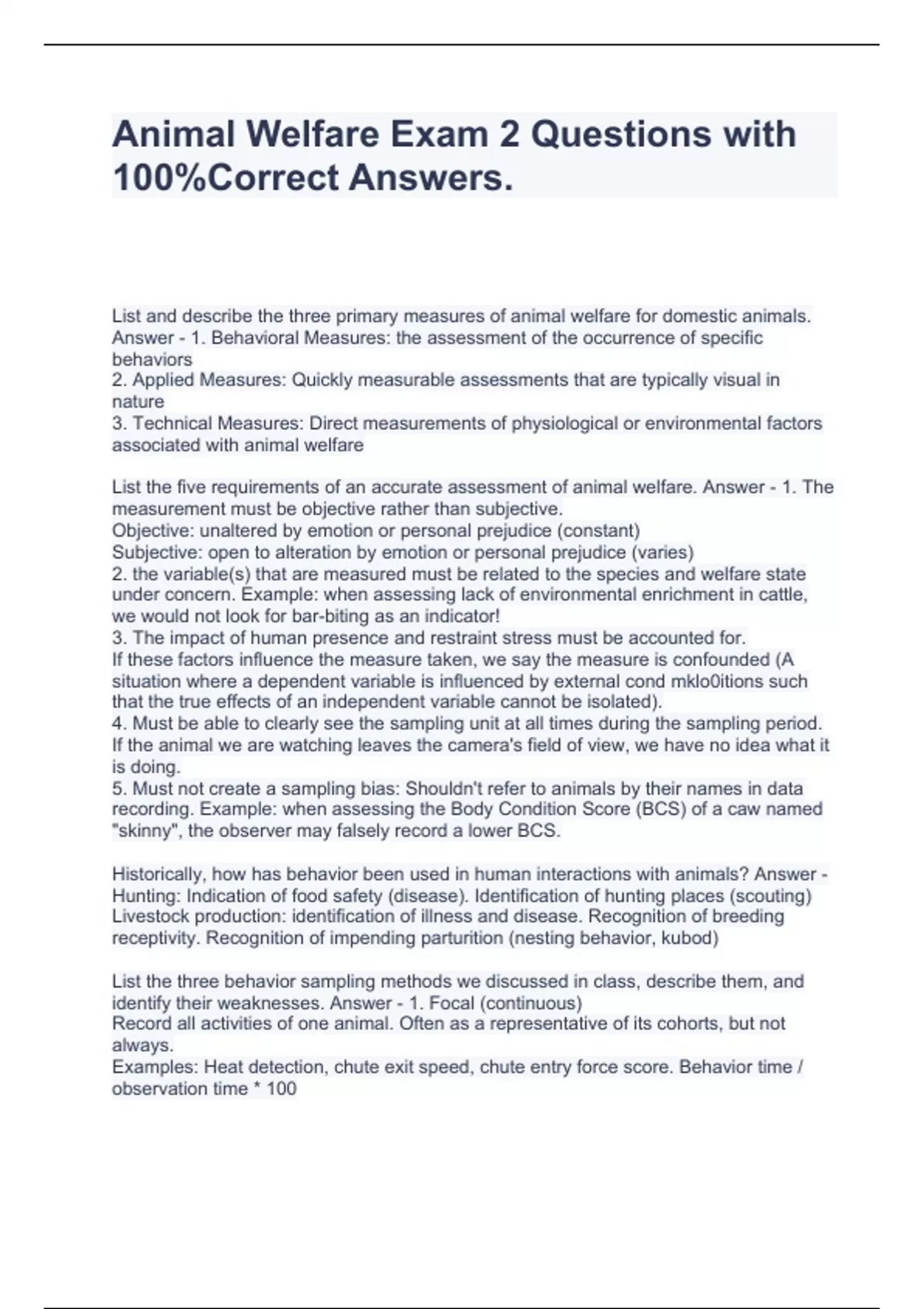 Animal Welfare Exam 2 Questions with 100%Correct Answers.
