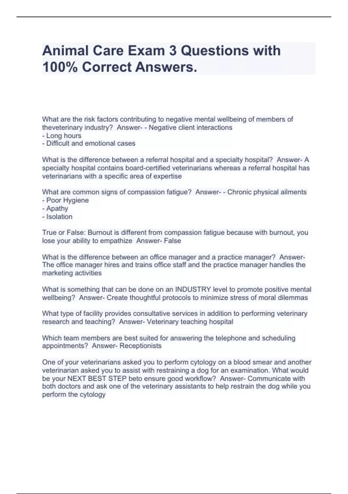 animal care exam 3 questions with 100 correct ans
