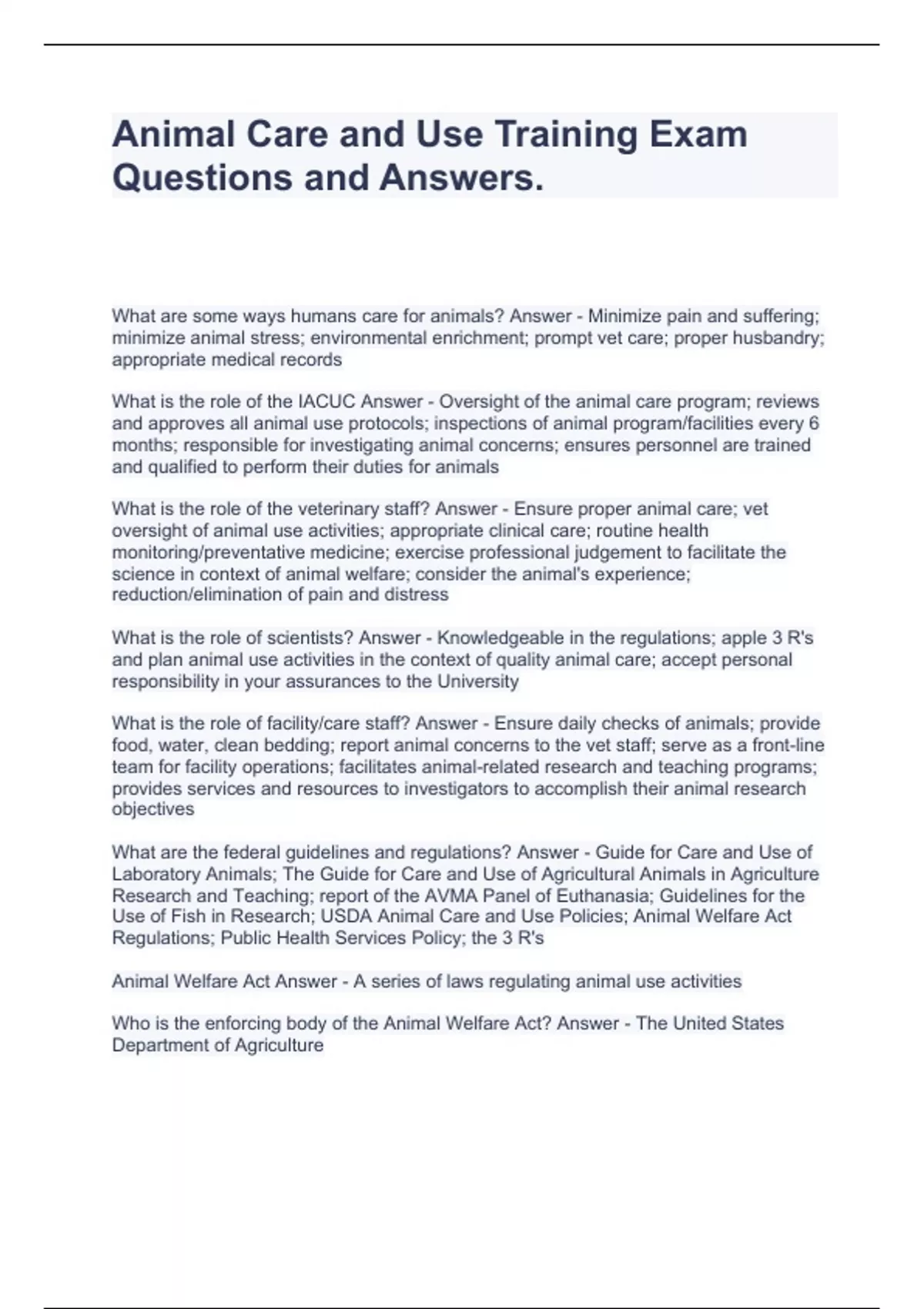 Animal Care and Use Training Exam Questions and Answers