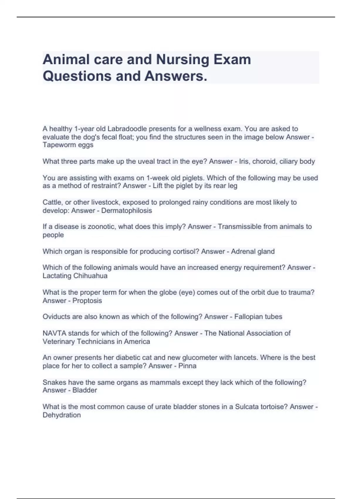 Animal care and Nursing Exam Questions and Answers