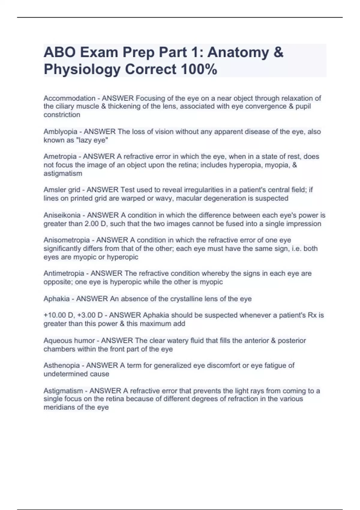 the ciliary muscle & thickening of the lens, associated with eye convergence & pupil constriction Accommodation - ANSWER Focusing of the eye on a near object through relaxation of Amblyopia - ANSWER The loss of vision without any apparent disease of the eye, also known as "lazy eye" Ametropia - ANSWER A refractive error in which the eye, when in a state of rest, does not focus the image of an object upon the retina; includes hyperopia, myopia, & astigmatism Amsler grid - ANSWER Test used to reveal irregularities in a patient's central field; if lines on printed grid are warped or wavy, macular degeneration is suspected Aniseikonia - ANSWER A condition in which the difference between each eye's power is greater than 2.00 D, such that the two images cannot be fused into a single impression Anisometropia - ANSWER A condition in which the refractive error of one eye significantly differs from that of the other; each eye must have the same sign, i.e. both eyes are myopic or hyperopic Antimetropia - ANSWER The refractive condition whereby the signs in each eye are opposite; one eye is hyperopic while the other is myopic Aphakia - ANSWER An absence of the crystalline lens of the eye +10.00 D, +3.00 D - ANSWER Aphakia should be suspected whenever a patient's Rx is greater than this power & this maximum add