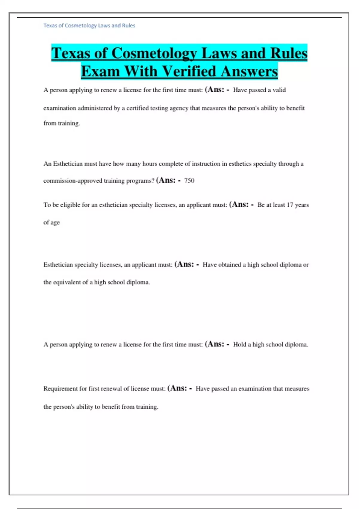 Texas of Cosmetology Laws and Rules Exam With Verified Answers