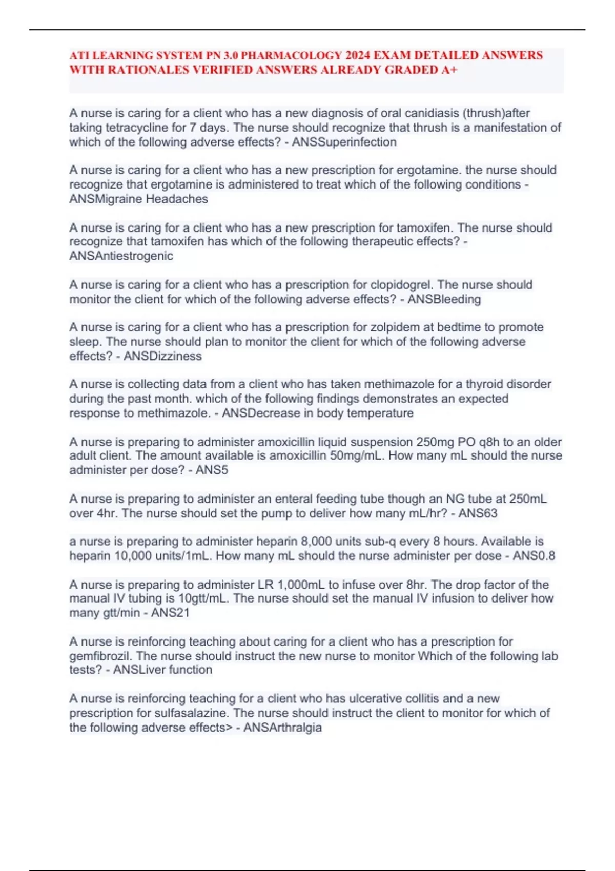 ATI LEARNING SYSTEM PN 3.0 PHARMACOLOGY 2024 EXAM DETAILED ANSWERS