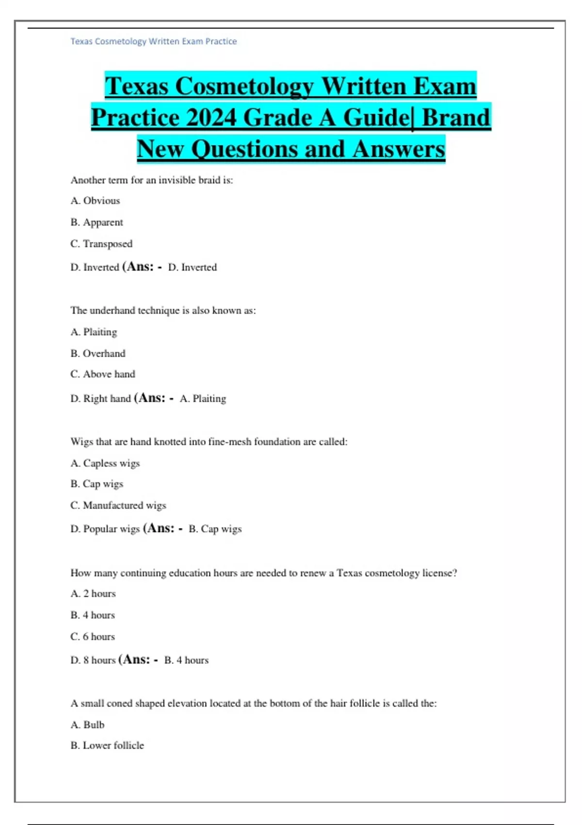 Texas Cosmetology Written Exam Practice 2024 Grade A Guide| Brand New Questions and Answers Another term for an invisible braid is: A. Obvious B. Apparent C. Transposed D. Inverted (Ans: - D. Inverted The underhand technique is also known as: A. Plaiting B. Overhand C. Above hand D. Right hand (Ans: - A. Plaiting Wigs that are hand knotted into fine-mesh foundation are called: A. Capless wigs B. Cap wigs C. Manufactured wigs D. Popular wigs (Ans: - B. Cap wigs How many continuing education hours are needed to renew a Texas cosmetology license? A. 2 hours B. 4 hours C. 6 hours D. 8 hours (Ans: - B. 4 hours A small coned shaped elevation located at the bottom of the hair follicle is called the: A. Bulb B. Lower follicle C. Dermal papilla D. Arrector pilli (Ans: - C. Dermal papilla Lines that are parallel to the floor are called: A. Perpendicular B. Horizontal C. Vertical D. Diagonal (Ans: - B. Horizontal