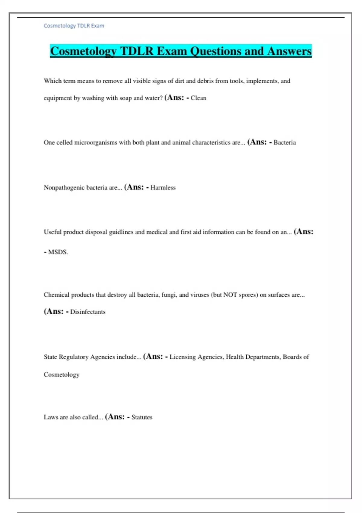 Cosmetology TDLR Exam Questions and Answers Which term means to remove all visible signs of dirt and debris from tools, implements, and equipment by washing with soap and water? (Ans: - Clean One celled microorganisms with both plant and animal characteristics are... (Ans: - Bacteria
