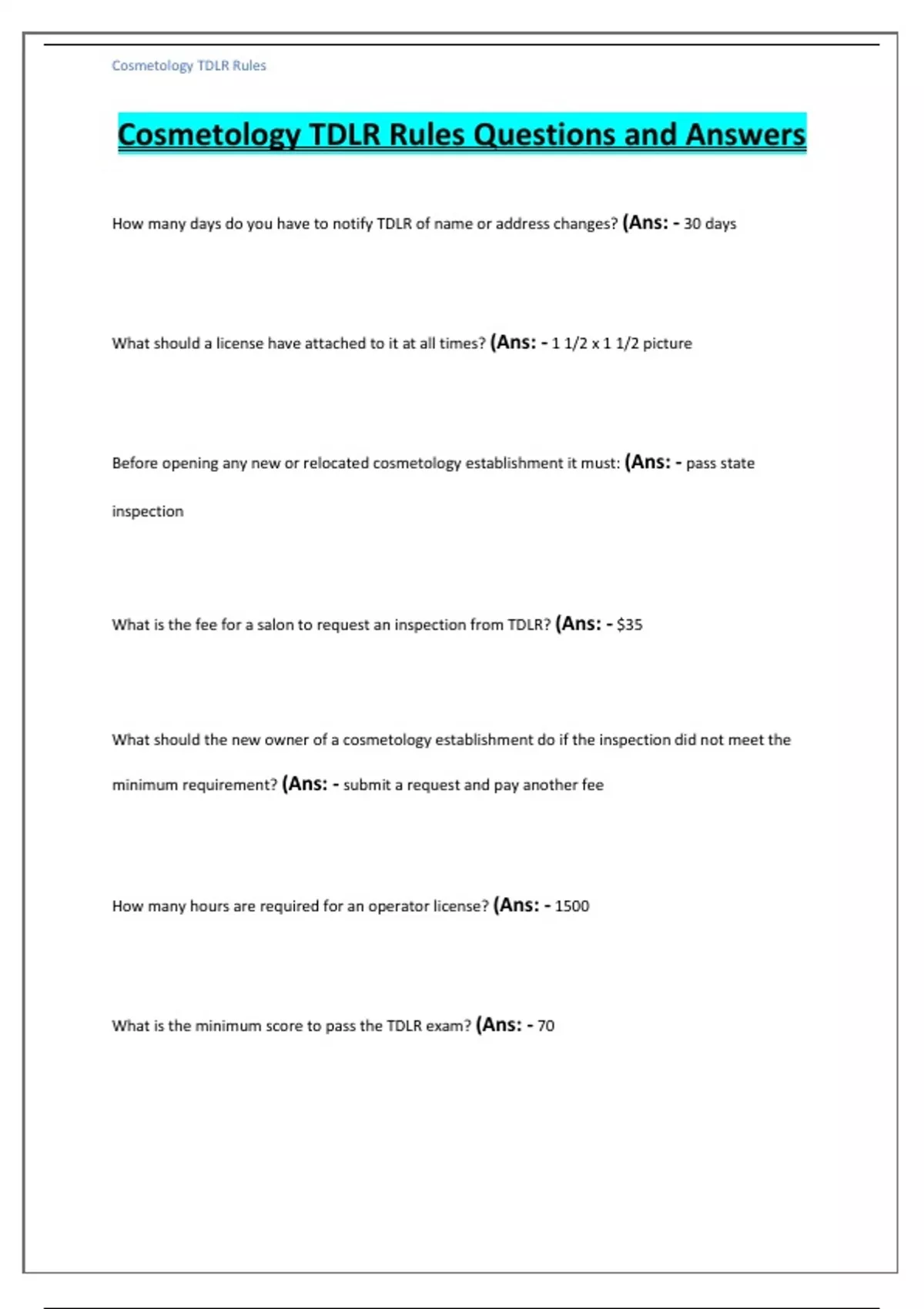 Cosmetology TDLR Rules Questions and Answers