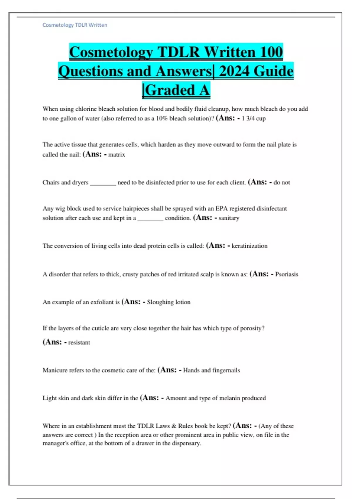 Cosmetology TDLR Written 100 Questions and Answers| 2024 Guide |Graded A