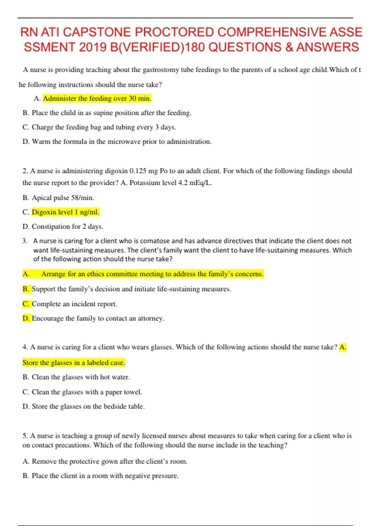 RN ATI CAPSTONE PROCTORED COMPREHENSIVE ASSE SSMENT 2019 B(VERIFIED)180 QUESTIONS & ANSWERS A nurse is providing teaching about the gastrostomy tube feedings to the parents of a school age child.Which of t he following instructions should the nurse take? A. Administer the feeding over 30 min. B. Place the child in as supine position after the feeding. C. Charge the feeding bag and tubing every 3 days. D. Warm the formula in the microwave prior to administration. 2. A nurse is administering digoxin 0.125 mg Po to an adult client. For which of the following findings should the nurse report to the provider? A. Potassium level 4.2 mEq/L. B. Apical pulse 58/min. C. Digoxin level 1 ng/ml. D. Constipation for 2 days. 3. A nurse is caring for a client who is comatose and has advance directives that indicate the client does not want life-sustaining measures. The client’s family want the client to have life-sustaining measures. Which of the following action should the nurse take? A. Arrange for an ethics committee meeting to address the family’s concerns. B. Support the family’s decision and initiate life-sustaining measures. C. Complete an incident report. D. Encourage the family to contact an attorney. 4. A nurse is caring for a client who wears glasses. Which of the following actions should the nurse take? A. Store the glasses in a labeled case. B. Clean the glasses with hot water. C. Clean the glasses with a paper towel. D. Store the glasses on the bedside table. 5. A nurse is teaching a group of newly licensed nurses about measures to take when caring for a client who is on contact precautions. Which of the following should the nurse include in the teaching? A. Remove the protective gown after the client’s room. B. Place the client in a room with negative pressure. C. Wear gloves when providing care to the client. D. Wear a mask when changing the linens in the client’s room. 6.A nurse is planning on care for a client who is recovering from an acute myocardial infarction that occurred 3 days ago. Which of the following instructions should the nurse include? A. Perform an ECG every 12 hr. B. Place the client in a supine position while resting. C. Draw a troponin level every 4hr. D. Obtain a cardiac rehabilitation consultation. 7. The nurse is reviewing the medical record of a client who is requesting combination oral contraceptives. Which of the following conditions in the client’s history is a contradiction to the use of oral contraceptives? A. Hyperthyroidism. B. Thrombophlebitis. C. Diverticulosis. D. Hypocalcemia. 8 A nurse is caring for a client who request the creation of a living will. Which of the following actions should the nurse take? A. Schedule a meeting between the hospital ethics committee and the client. B. Evaluate the client’s understanding of life-sustaining measures. C. Determine the client’s preferences about post mortem care. D. Request a conference with the client’s family