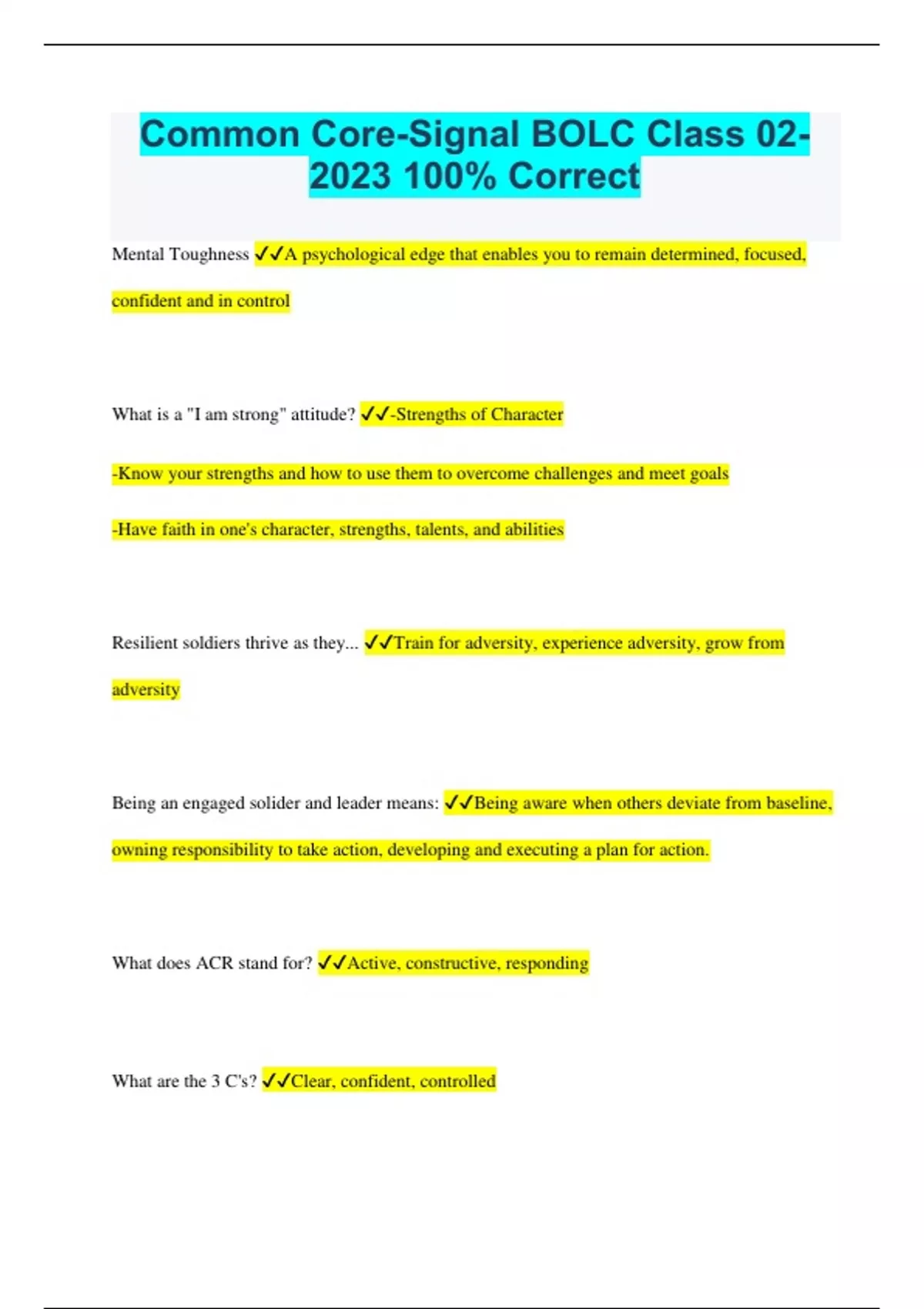 2023 100% Correct Mental Toughness ✔✔A psychological edge that enables you to remain determined, focused, confident and in control What is a "I am strong" attitude? ✔✔-Strengths of Character -Know your strengths and how to use them to overcome challenges and meet goals -Have faith in one's character, strengths, talents, and abilities Resilient soldiers thrive as they... ✔✔Train for adversity, experience adversity, grow from adversity Being an engaged solider and leader means: ✔✔Being aware when others deviate from baselin e, owning responsibility to take action, developing and executing a plan for action. What does ACR stand for? ✔✔Active, constructive, responding What are the 3 C's? ✔✔Clear, confident, controlled What are the 8 TLPs? ✔✔1.) Receive the mission 2.) Issue a Warning Order 3.) Make a Tentative plan 4.) Start Necessary Movement 5.) Conduct Reconnaissance 6.) Complete the plan 7.) Issue the Operation order 8.) Supervise Risk Management Process ✔✔1.) Identify the hazard 2.) Asses the hazard 3.) Develop controls and make risk decisions 4.) Implement controls 5.) Supervise and Evaluate Types of Developmental Counselings ✔✔1.) Event 2.) Performance