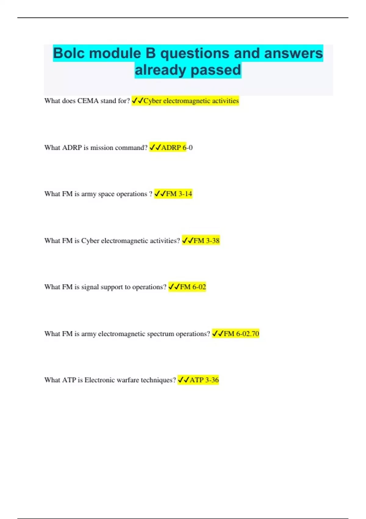 Bolc module B questions and answers already passed What does CEMA stand for? Cyber electromagnetic activities What ADRP is mission command? ADRP 6-0 What FM is army space operations ? FM 3-14 What FM is Cyber electromagnetic activities? FM 3-38 What FM is signal support to operations? FM 6-02 What FM is army electromagnetic spectrum operations? FM 6-02.70 What ATP is Electronic warfare techniques? ATP 3-36 the mission command war fighting function now includes four primary staff tasks. what are they? Conduct the operational process conduct the knowledge management and information management conduct inform and influence activities conduct cyber electromagnetic activities What are the five domains? land, air, maritime, space, cyberspace CEMA consists of three activities, what are they? Cyberspace operations (CO), electronic warfare (EW), and Spectrum management operations (SMO) What are CEMA activities leveraged for? they are leveraged to seize, retain, and exploit and advantage over adversaries and enemies in both cyberspace and the electromagnetic spectrum, while simultaneously denying and degrading adversary and enemy use of the same and protecting the mission command system What do we use electronic warfare for? we use EW and directed energy to control the electromagnetic spectrum or to attack the enemy what do we use Spectrum management operations for? we use it to plan, coordinate, and manage the use of the electromagnetic spectrum through operational, engineering, and administrative procedures to deconflict all systems. What is cyberspace operations used for? it is used to employ cyberspace capabilities to achieve objectives Cyberspace is broken down into three operations. what are they? Offensive cyberspace operations (OCO) Defensive cyberspace operations (DCO) DOD information network operations (DODIN) what is OCO? offensive cyberspace operations- operations conducted to project power by the application of force against enemies and adversaries in and through cyberspace what is DCO? defensive cyberspace operations- operations conducted to defend DOD or other friendly cyberspace and preserve the ability to utilize friendly cyberspace capabilities What is DODIN? DOD information- operations to design, build, configure, secure, operate, maintain, and sustain networks What are the three elements of EW (electronic warfare)? electronic attack (EA) electronic protection (EP) electronic warfare support (ES) What is the electromagnetic spectrum? the electromagnetic spectrum is the range of frequencies of electromagnetic radiation from zero to infinity. it is divided into 26 alphabetically designated bands? When can CEMA occur in the electromagnetic spectrum? CEMA can occur in and through the EMS What is SMO? spectrum management operations- they are the interrelated functions of spectrum management... that enable the planning, management, and execution of operations within the electromagnetic operational environment What is a junior leaders role in planning for CEMA? gain situational understanding of the OE to enable CEMA integration, participate in the target developmental process and recommend CEMA effects where appropriate, coordinate directly with the staff and attend battle rhythm events involving CEMA, employ TLPs and ensure measures are in place to protect and defend the mission command system what are some limitations to space capabilities? orbital parameters, predictability, terrain , terrestrial and space weather, high demand, low density asset. who is the division commanders primary organic advisor on space operations? the space support element What DA PAM is used for risk management? DA PAM 385-30 What ATP is used for risk management? ATP 5-19 What are the 5 steps of risk management? identify hazards, assess hazards, develop controls and make risk decision, implement controls, and supervise and evaluate What is metttc? Mission, enemy, terrain, troops, time, civilian considerations What is ADTPTL? used to identify non-mission hazards- activity, disrupters, terrain, people, time, legal what are the three forms of control? educational, physical, avoidance or elimination whats an example of educational control? performance to standards- training on how to do a squat whats an example of a physical control? barriers, guards- putting a cone over a hole in the ground What are effective controls? they must be suitable, feasible, and acceptable what is the purpose of RM? the purpose is: to provide the basis for sound risk decision to determine what constitutes an acceptable level of risk to balance potential loss against expected gain to make risk decisions at the appropriate level of command what are methods of implementing these controls? orders (verbal or written), policies, programs, doctrine, mission briefings, staff estimates as a leader in RM what do we need to do? we must: enforce standards, evaluate effectiveness of controls apply continuously What AR is property? AR 735-5 or AR 710-2