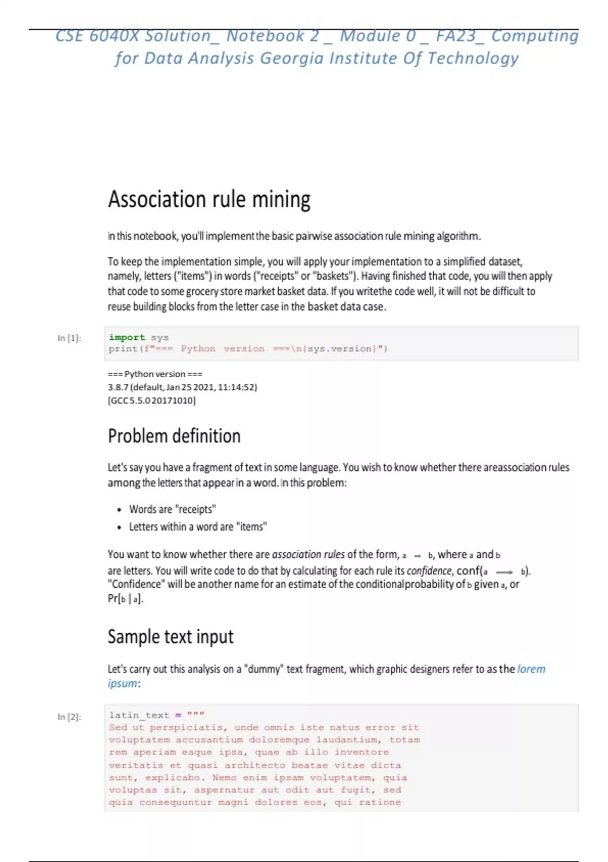CSE 6040X Solution_ Notebook 2 _ Module 0 _ FA23_ Computing for Data Analysis Georgia Institute Of Technology Association rule mining In this notebook, you'll implement the basic pairwise association rule mining algorithm. To keep the implementation simple, you will apply your implementation to a simplified dataset, namely, letters ("items") in words ("receipts" or "baskets"). Having finished that code, you will then apply that code to some grocery store market basket data. If you writethe code well, it will not be difficult to reuse building blocks from the letter case in the basket data case. In [1]: === Python version === 3.8.7 (default,Jan 25 2021, 11:14:52) [GCC5.5.]