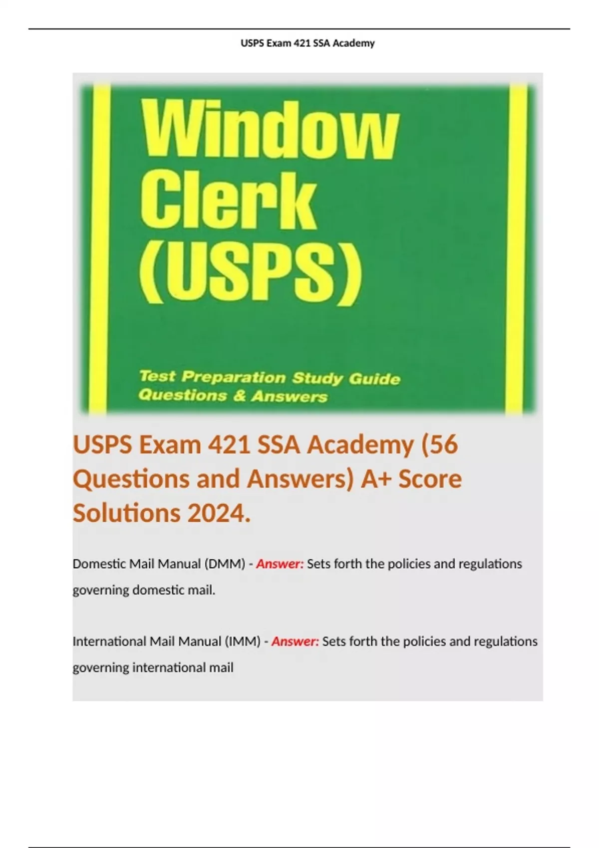 USPS Exam 421 SSA Academy (56 Questions and Answers) A+ Score Solutions 2024. Terms like: Domestic Mail Manual (DMM) - Answer: Sets forth the policies and regulations governing domestic mail.