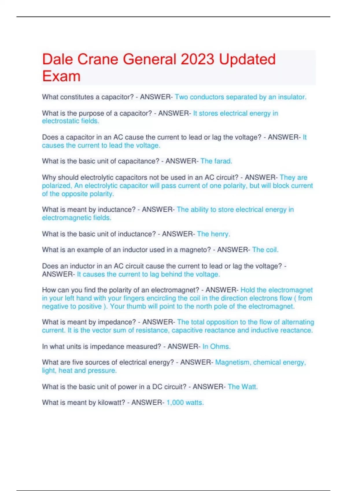 What constitutes a capacitor? - ANSWER- Two conductors separated by an insulator. What is the purpose of a capacitor? - ANSWER- It stores electrical energy in electrostatic fields. Does a capacitor in an AC cause the current to lead or lag the voltage? - ANSWER- It causes the current to lead the voltage. What is the basic unit of capacitance? - ANSWER- The farad. Why should electrolytic capacitors not be used in an AC circuit? - ANSWER- They are polarized, An electrolytic capacitor will pass current of one polarity, but will block current of the opposite polarity. What is meant by inductance? - ANSWER- The ability to store electrical energy in electromagnetic fields. What is the basic unit of inductance? - ANSWER- The henry. What is an example of an inductor used in a magneto? - ANSWER- The coil. Does an inductor in an AC circuit cause the current to lead or lag the voltage? - ANSWER- It causes the current to lag behind the voltage. How can you find the polarity of an electromagnet? - ANSWER- Hold the electromagnet in your left hand with your fingers encircling the coil in the direction electrons flow ( from negative to positive ). Your thumb will point to the north pole of the electromagnet. What is meant by impedance? - ANSWER- The total opposition to the flow of alternating current. It is the vector sum of resistance, capacitive reactance and inductive reactance. In what units is impedance measured? - ANSWER- In Ohms. What are five sources of electrical energy? - ANSWER- Magnetism, chemical energy, light, heat and pressure. What is the basic unit of power in a DC circuit? - ANSWER- The Watt. What is meant by kilowatt? - ANSWER- 1,000 watts. What is meant by a megawatt? - ANSWER- 1,000,000 watts. What is the formula for power in a DC circuit? - ANSWER- Power= Voltage times Current (P = E • I). What is the relationship between mechanical and electrical power? - ANSWER- 1 Horsepower = 746 Watts. What is meant by true power in an AC circuit? - ANSWER- The product of circuit voltage and the current that is in phase with this voltage. In what units is true power expressed? - ANSWER- In watts. What is meant by apparent power in an AC circuit? - ANSWER- The product of the circuit voltage and the circuit current. In what units is apparent power expressed? - ANSWER- In Volt-amps. What is meant by reactive power in an AC circuit? - ANSWER- The power consumed in the inductive and capacitive reactances in an AC circuit. Reactive power is also called wattless power. In what unit is reactive power expressed? - ANSWER- In volt-amps reactive (VAR), or kilovolt-amps reactive (KVAR). What is meant by power factor in AC circuit? - ANSWER- The ratio of true power to apparent power. It is also the ratio of circuit resistance to circuit impedance. Which law of electricity is the most important for an aircraft mechanic to know? - ANSWER- What are the elements of ohm's law Ohm's law. What is voltage? - ANSWER- Electrical pressure. What is the basic unit of voltage? - ANSWER- The volt. What instrument is used to measure voltage? - ANSWER- A voltmeter To measure voltage, is a voltmeter placed in series or in parallel with the source of voltage? - ANSWER- In parallel. What is electrical current? - ANSWER- The flow of electrons in a circuit. What is the basic unit of current flow? - ANSWER- The ampere (amp) What part of an amp is a milliamp? - ANSWER- One thousandth (0.001) of an amp What instrument is used to measure current flow? - ANSWER- An ammeter. What two things happen when current flows through a conductor? - ANSWER- Heat is generated and a magnetic field surrounds the conductor. To measure current through a component, is an ammeter placed in parallel or in series with the component? - ANSWER- In series. What is meant by resistance in an electrical circuit? - ANSWER- The opposition to the flow of electrons. What is the basic unit of electrical resistance? - ANSWER- The ohm. What is a megohm? - ANSWER- One million (1,000,000) ohms. What four things affect the resistance of electrical conductor? - ANSWER- The material, the cross-sectional area, the length and the temperature. What instrument is used to measure electrical resistance? - ANSWER- An ohmmeter. How can you tell the resistance of a composition resistance? - ANSWER- By a series of colored bands around one end of the resistor. What is meant by continuity in an electrical circuit? - ANSWER- The circuit is continuous (or complete) when electrons can flow from one terminal of the power source to the other. What is the instrument is used to measure continuity in an electrical circuit? - ANSWER- An ohmmeter. When measuring resistance of a component with an ohmmeter, should the circuit be energized? - ANSWER- No, there should be no power on the circuit. What are three things must an electrical circuit contain? - ANSWER- A source of electrical energy, a load to use the energy and conductors to join the source and the load. What are three types of DC circuits with regard to the placement of the various circuit components? - ANSWER- Series, parallel and series-parallel What is the name of the law that describes the relationship in an electrical circuit of voltage, current and resistance? - ANSWER- Ohm's law. What is the basic equation of ohm's law? - ANSWER- E= I×R