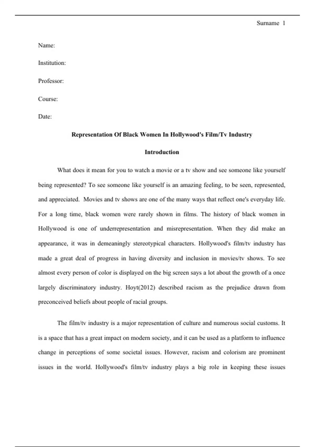Representation Of Black Women In Hollywood's Film/Tv Industry Introduction What does it mean for you to watch a movie or a tv show and see someone like yourself being represented? To see someone like yourself is an amazing feeling, to be seen, represented, and appreciated. Movies and tv shows are one of the many ways that reflect one's everyday life. For a long time, black women were rarely shown in films. The history of black women in Hollywood is one of underrepresentation and misrepresentation. When they did make an appearance, it was in demeaningly stereotypical characters. Hollywood's film/tv industry has made a great deal of progress in having diversity and inclusion in movies/tv shows. To see almost every person of color is displayed on the big screen says a lot about the growth of a once largely discriminatory industry. Hoyt(2012) described racism as the prejudice drawn from preconceived beliefs about people of racial groups. The film/tv industry is a major representation of culture and numerous social customs. It is a space that has a great impact on modern society, and it can be used as a platform to influence change in perceptions of some societal issues. However, racism and colorism are prominent issues in the world. Hollywood's film/tv industry plays a big role in keeping these issues relevant. "What I see Hollywood do is feature one or two of us, and they'll ignore the rest of us like we don't exist," Kimberly Elise says. She had to say about black women and their representation in Hollywood. With all of the progress made in the film/tv industry, it seems to have been halted. Black people have been perceived and treated as less than completely human throughout history. Hollywood is no exception. Although black girls and women make up 6.5 percent of the U.S. population, they only makeup 3.7 percent of the leads and co-leads in the top 100 grossing films in the last decade. The tv/film industry has been mentioned as the most discriminatory sector concerning who should be hired and what roles. The