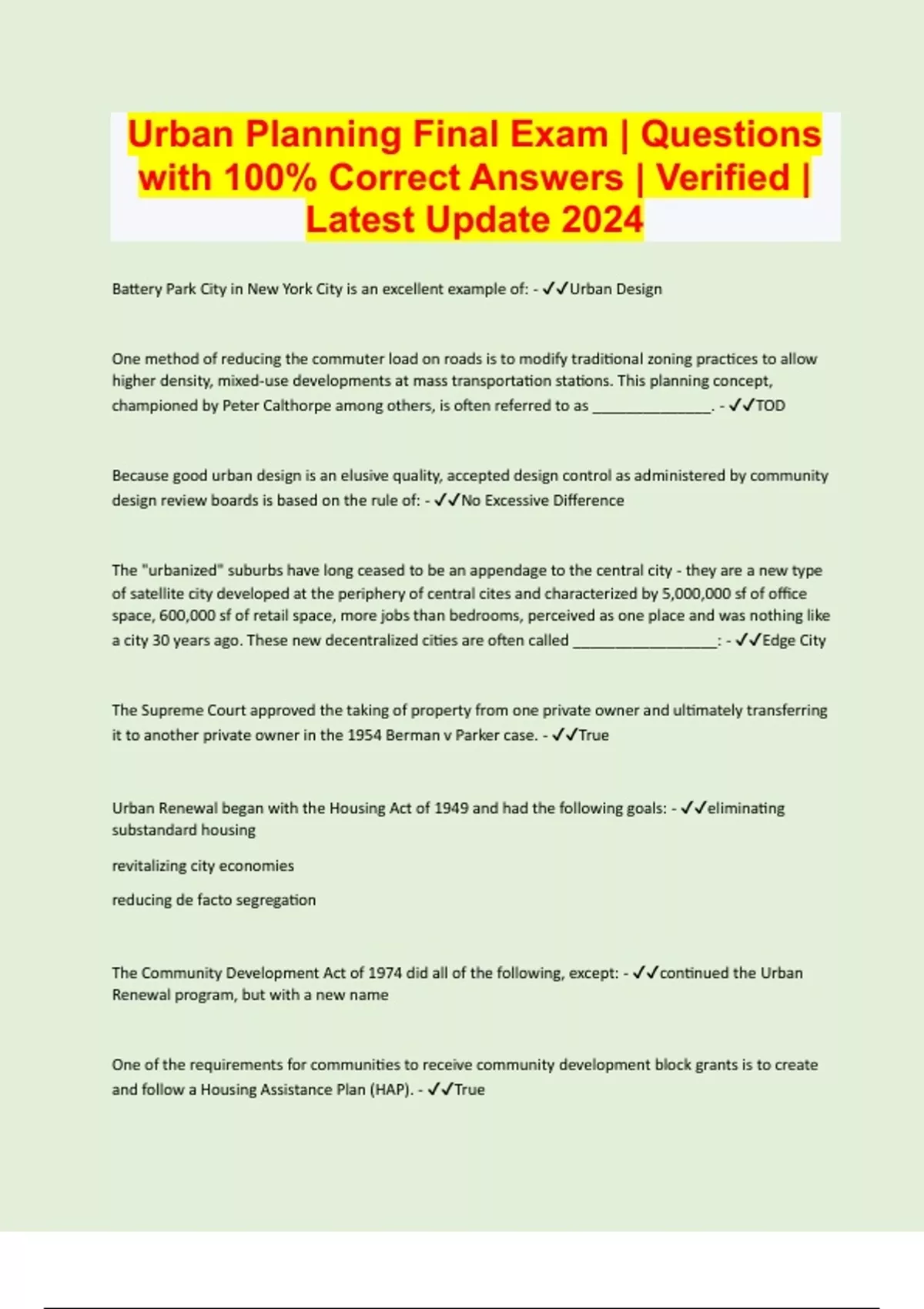 Urban Planning Final Exam | Questions with 100% Correct Answers | Verified | Latest Update 2024