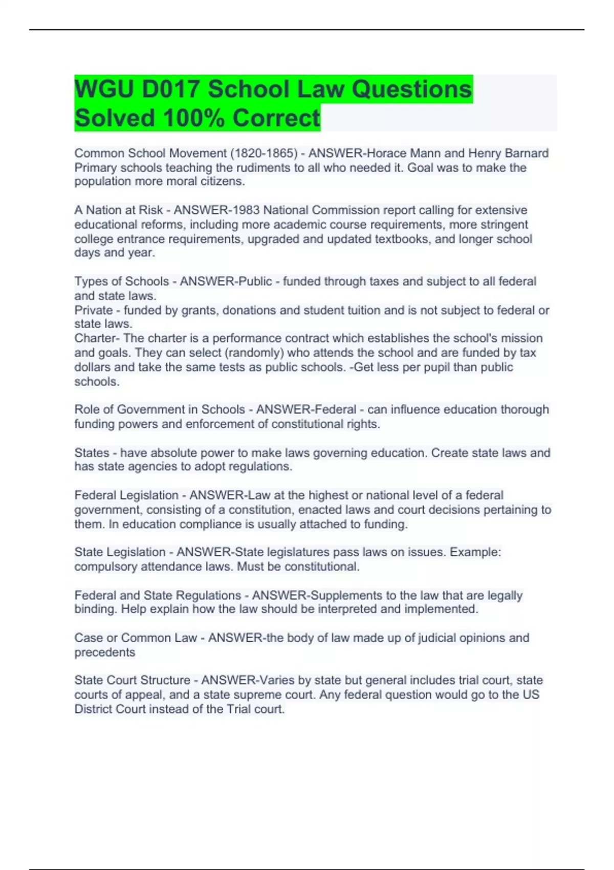Common School Movement () - ANSWER-Horace Mann and Henry Barnard Primary schools teaching the rudiments to all who needed it. Goal was to make the population more moral citizens. A Nation at Risk - ANSWER-1983 National Commission report calling for extensive educational reforms, including more academic course requirements, more stringent college entrance requirements, upgraded and updated textbooks, and longer school days and year. Types of Schools - ANSWER-Public - funded through taxes and subject to all federal and state laws. Private - funded by grants, donations and student tuition and is not subject to federal or state laws. Charter- The charter is a performance contract which establishes the school's mission and goals. They can select (randomly) who attends the school and are funded by tax dollars and take the same tests as public schools. -Get less per pupil than public schools. Role of Government in Schools - ANSWER-Federal - can influence education thorough funding powers and enforcement of constitutional rights. States - have absolute power to make laws governing education. Create state laws and has state agencies to adopt regulations. Federal Legislation - ANSWER-Law at the highest or national level of a federal government, consisting of a constitution, enacted laws and court decisions pertaining to them. In education compliance is usually attached to funding. State Legislation - ANSWER-State legislatures pass laws on issues. Example: compulsory attendance laws. Must be constitutional. Federal and State Regulations - ANSWER-Supplements to the law that are legally binding. Help explain how the law should be interpreted and implemented. Case or Common Law - ANSWER-the body of law made up of judicial opinions and precedents State Court Structure - ANSWER-Varies by state but general includes trial court, state courts of appeal, and a state supreme court. Any federal question would go to the US District Court instead of the Trial court. Separate but Equal Doctrine - ANSWER-The doctrine established in Plessy v. Ferguson that African Americans could constitutionally be kept in separate but equal facilities. De Jour Segregation vs De Facto Segregation - ANSWER-De Jour - unnatural or forced state mandated segregation. -unconstitutional De Facto - natural segregation caused by house patterns for example. -not unconstitutional Brown v. Board of Ed. of Topeka - ANSWER-"We conclude that in the field of public education the doctrine of 'separate-but-equal' has no place. Separate educational facilities are inherently unequal." Demonstrated that education is a civil right and therefore discrimination in education is unconstitutional. Unitary System - ANSWER-Court has defined a unitary system as the status a school system achieves "when it no longer discriminates between school children on the basis of race," ReZoning of Schools - ANSWER-Because of a long history of gerrymandering boundary lines with the intent to segregate, many school boundaries during the 1950s and 1960s had little to do with geographic barriers (e.g., rivers, hills); safety issues (e.g., location of busy roads, factories); or the size, location, or dispersion of the student population. When the schools were rezoned with good faith the schools were better integrated. 1st Amendment (Religion,spe
