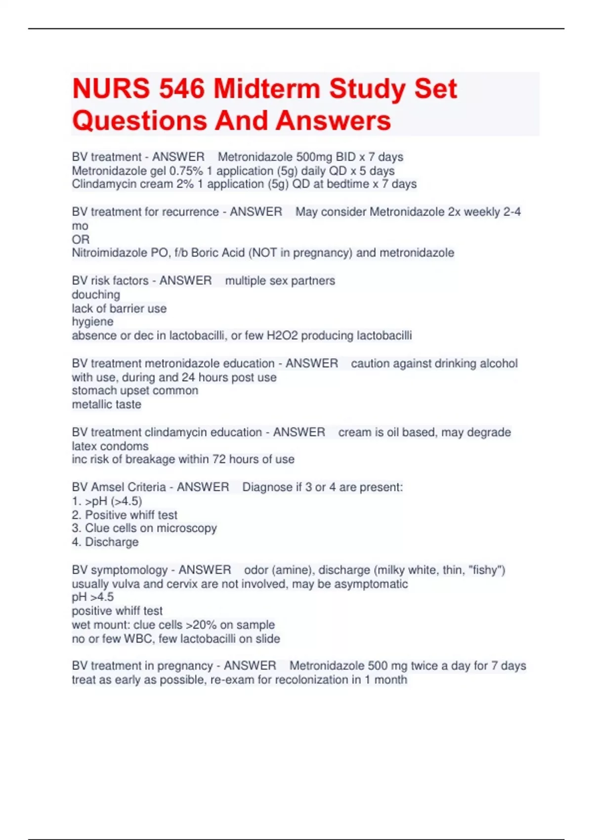 NURS 546 Midterm Study Set Questions And Answers BV treatment - ANSWER Metronidazole 500mg BID x 7 days Metronidazole gel 0.75% 1 application (5g) daily QD x 5 days Clindamycin cream 2% 1 application (5g) QD at bedtime x 7 days BV treatment for recurrence - ANSWER May consider Metronidazole 2x weekly 2-4 mo OR Nitroimidazole PO, f/b Boric Acid (NOT in pregnancy) and metronidazole BV risk factors - ANSWER multiple sex partners douching lack of barrier use hygiene absence or dec in lactobacilli, or few H2O2 producing lactobacilli BV treatment metronidazole education - ANSWER caution against drinking alcohol with use, during and 24 hours post use stomach upset common metallic taste BV treatment clindamycin education - ANSWER cream is oil based, may degrade latex condoms inc risk of breakage within 72 hours of use BV Amsel Criteria - ANSWER Diagnose if 3 or 4 are present: 1. pH (4.5) 2. Positive whiff test 3. Clue cells on microscopy 4. Discharge BV symptomology - ANSWER odor (amine), discharge (milky white, thin, "fishy") usually vulva and cervix are not involved, may be asymptomatic pH 4.5 positive whiff test wet mount: clue cells 20% on sample no or few WBC, few lactobacilli on slide BV treatment in pregnancy - ANSWER Metronidazole 500 mg twice a day for 7 days treat as early as possible, re-exam for recolonization in 1 month Candidiasis (VVC) s/s - ANSWER thickened, curd-like "cottage cheese" white discharge *pruritus* vulva and labial swelling and erythema, erythematic vaginal walls no odor no common effect on cervix pH usually 4.5 Dx of Candidiasis (VVC) - ANSWER wet mount KOH will see pseudohyphae or spores Tx of VVC - ANSWER OTC intravaginal meds: Butoconazole (Gynazole), Clotrimazole (Gyne-Lotrimin), Miconazole (Monistat), Tioconazole (Vagistat) creams Prescription intravaginal agents: Nystatin (Mycostatin) vaginal tablet 100,000 unit for 14 days Prescription oral agent: Fluconazole (Diflucan) 150mg tablet PO once Complicated VVC - ANSWER Recurrent (RVVC) 4 or more episodes in one year Severe - edema, excoriation, fissure formation Non-albicans strain Compromised host Tx for RVVC - ANSWER 7-14 days topical therapy PLUS Fluconazole 100, 150 or 200mg given every 3rd day (1, 4, 7) Treatment for VVC in pregnancy - ANSWER 7 days topical therapy *Fluconazole is contraindicated* KOH prep kills off all _____ _______ cells - ANSWER non-fungal Trichomoniasis symptomology - ANSWER itching, discharge, 70% may be asymptomatic frothy, gray, yellow/green discharge cervical petechiae (strawberry cervix) dysuria, dyspareunia pH 4.5 may have positive whiff test wet mount: motile protozoa, many WBC treatment of partner required in: - ANSWER BV - No