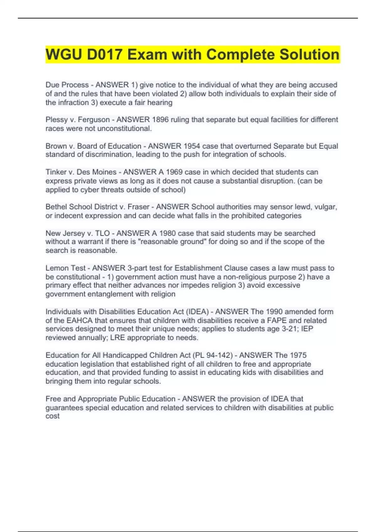 wgu d017 school law questions solved 100 correct