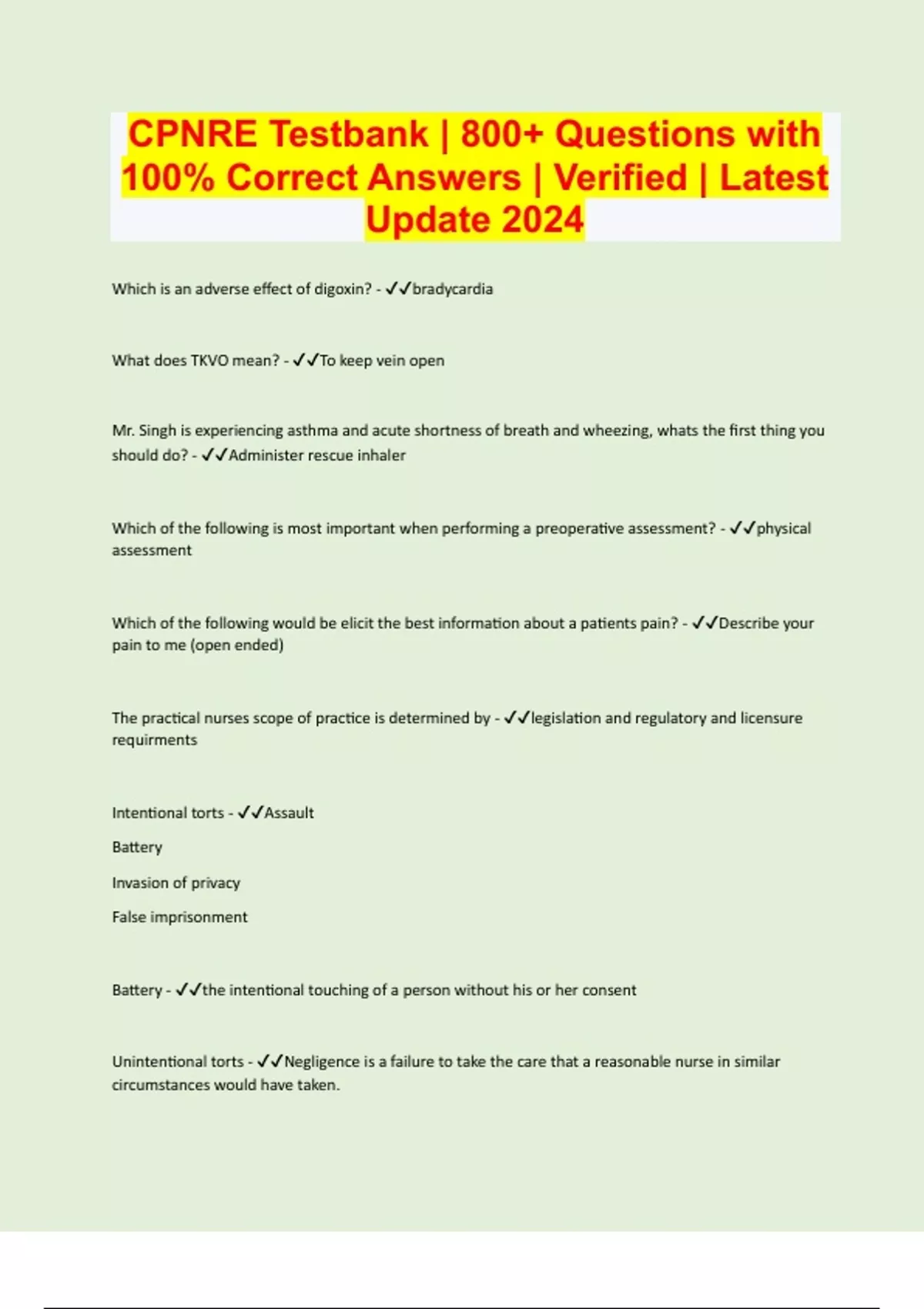 CPNRE Testbank | 800+ Questions with 100% Correct Answers | Verified | Latest Update 2024