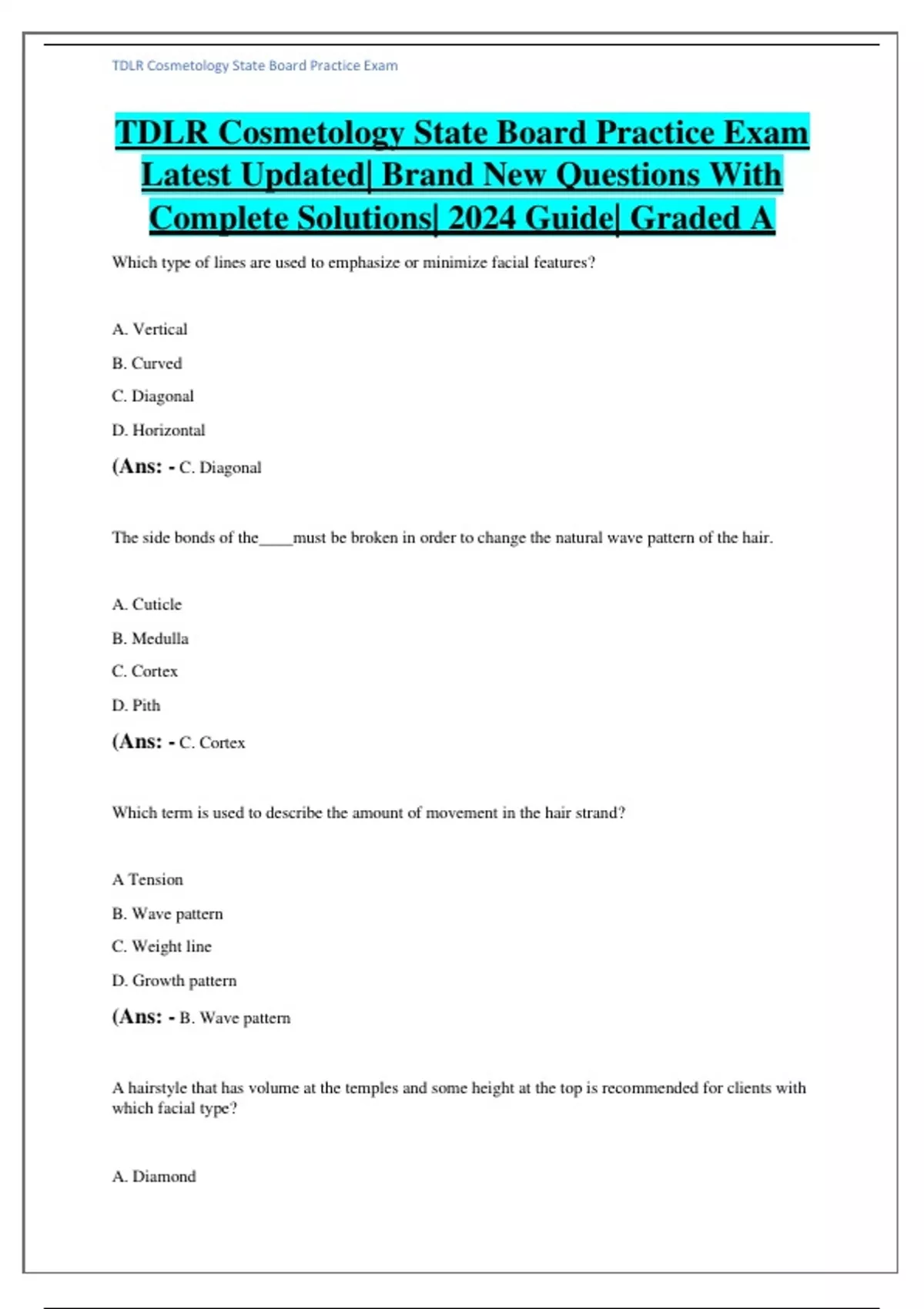 TDLR Cosmetology State Board Practice Exam Latest Updated| Brand New Questions With Complete Solutions| 2024 Guide| Graded A Which type of lines are used to emphasize or minimize facial features? A. Vertical B. Curved C. Diagonal D. Horizontal (Ans: - C. Diagonal The side bonds of the____must be broken in order to change the natural wave pattern of the hair. A. Cuticle B. Medulla C. Cortex D. Pith (Ans: - C. Cortex Which term is used to describe the amount of movement in the hair strand? A Tension B. Wave pattern C. Weight line D. Growth pattern (Ans: - B. Wave pattern A hairstyle that has volume at the temples and some height at the top is recommended for clients with which facial type? A. Diamond B. Triangle C. Inverted triangle D. Oblong (Ans: - B. Triangle