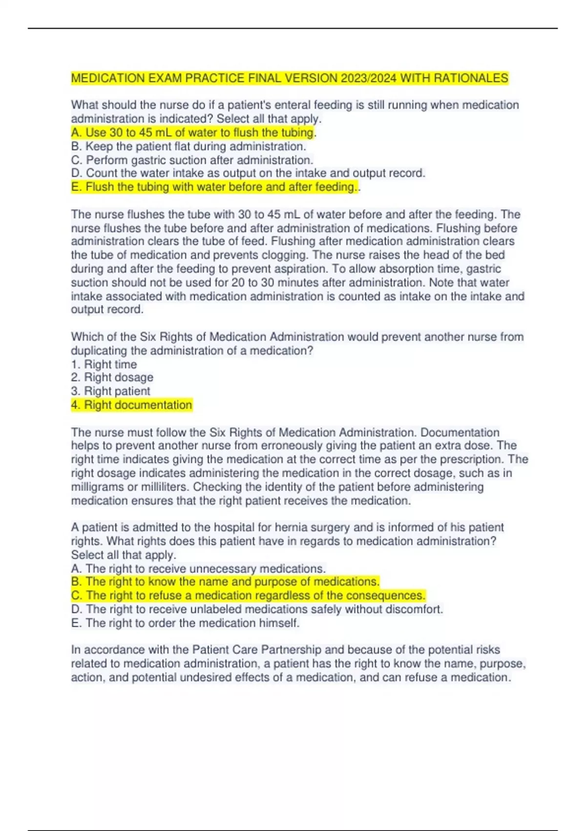 MEDICATION EXAM PRACTICE FINAL VERSION 2023/2024 WITH RATIONALES