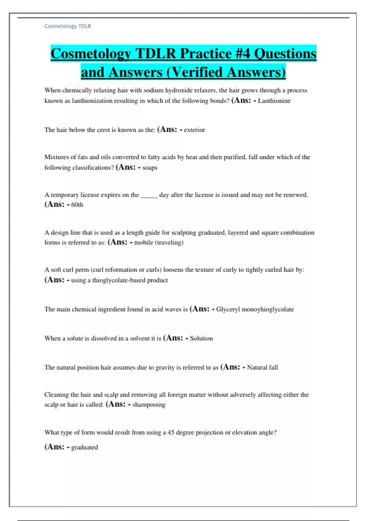 Cosmetology TDLR Practice #4 Questions and Answers (Verified Answers)