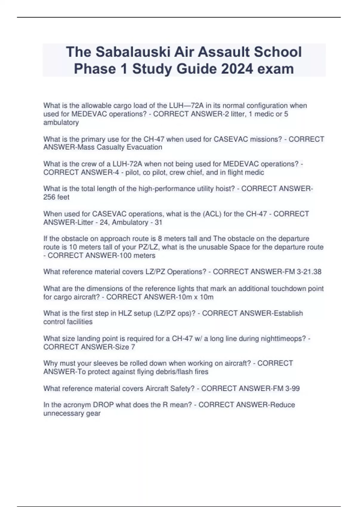 The Sabalauski Air Assault School Phase 1 Study Guide 2024 exam What is the allowable cargo load of the LUH—72A in its normal configuration when used for MEDEVAC operations? - CORRECT ANSWER-2 litter, 1 medic or 5 ambulatory What is the primary use for the CH-47 when used for CASEVAC missions? - CORRECT ANSWER-Mass Casualty Evacuation What is the crew of a LUH-72A when not being used for MEDEVAC operations? - CORRECT ANSWER-4 - pilot, co pilot, crew chief, and in flight medic What is the total length of the high-performance utility hoist? - CORRECT ANSWER256 feet When used for CASEVAC operations, what is the (ACL) for the CH-47 - CORRECT ANSWER-Litter - 24, Ambulatory - 31 If the obstacle on approach route is 8 meters tall and The obstacle on the departure route is 10 meters tall of your PZ/LZ, what is the unusable Space for the departure route - CORRECT ANSWER-100 meters What reference material covers LZ/PZ Operations? - CORRECT ANSWER-FM 3-21.38 What are the dimensions of the reference lights that mark an additional touchdown point for cargo aircraft? - CORRECT ANSWER-10m x 10m What is the first step in HLZ setup (LZ/PZ ops)? - CORRECT ANSWER-Establish control facilities What size landing point is required for a CH-47 w/ a long line during nighttimeops? - CORRECT ANSWER-Size 7 Why must your sleeves be rolled down when working on aircraft? - CORRECT ANSWER-To protect against flying debris/flash fires What reference material covers Aircraft Safety? - CORRECT ANSWER-FM 3-99 In the acronym DROP what does the R mean? - CORRECT ANSWER-Reduce unnecessary gear What are the three portions of the aircraft must be avoided? - CORRECT ANSWERMain & Tail rotor blades, cargo hook (static electricity) In case of fire, when should you exit the aircraft? - CORRECT ANSWER-Immediately Define Air Assault operations - CORRECT ANSWER-Movement of friendly assault forces by rotary wing aircraft to engage enemy forces or to seize key terrain. What is chalk/load defined as - CORRECT ANSWER-personnel or equipment designated to a specific aircraft What are the 6 factors that determine abort criteria? - CORRECT ANSWER-Weather, Available Aircraft, Time, Mission Essential Combat Power, Mission Criticality, Enemy What are the components of an Air Route? - CORRECT ANSWER-Start point, release point, air control point, flight path What are the three terrain flight modes? - CORRECT ANSWER-NAP of the Earth, Contour, Low Level What reference material covers Aircraft Orientation? - CORRECT ANSWER-FM 3-04 What is the cruise speed of the AH-6J/MH-6J? - CORRECT ANSWER-135 knots What is the reference material that covers aircraft orientation - CORRECT ANSWERFM 3-04 What is the maximum airspeed of the AH-64 - CORRECT ANSWER-140-145 knots Max ACL for the MV-22 w/out seats? - CORRECT ANSWER-32 PAX What is the proper angle to approach the LUH-72A w/ engines running? - CORRECT ANSWER-45 degree angle from the front