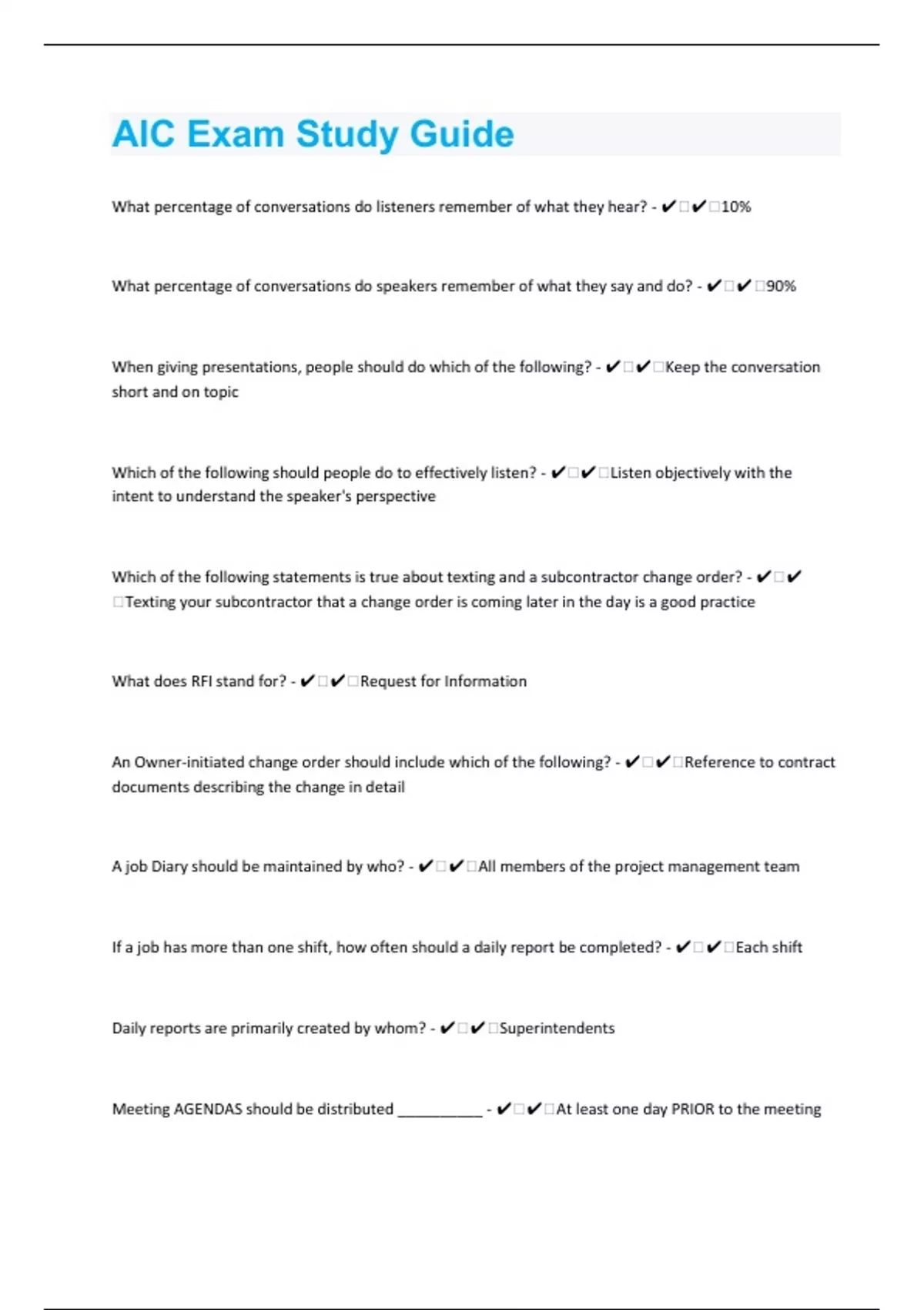 What percentage of conversations do listeners remember of what they hear? - ️️10% What percentage of conversations do speakers remember of what they say and do? - ️️90% When giving presentations, people should do which of the following? - ️️Keep the conversation short and on topic Which of the following should people do to effectively listen? - ️️Listen objectively with the intent to understand the speaker's perspective Which of the following statements is true about texting and a subcontractor change order? - ️️Texting your subcontractor that a change order is coming later in the day is a good practice What does RFI stand for? - ️️Request for Information An Owner-initiated change order should include which of the following? - ️️Reference to contract documents describing the change in detail A job Diary should be maintained by who? - ️️All members of the project management team If a job has more than one shift, how often should a daily report be completed? - ️️Each shift Daily reports are primarily created by whom? - ️️Superintendents Meeting AGENDAS should be distributed __________ - ️️At least one day PRIOR to the meeting