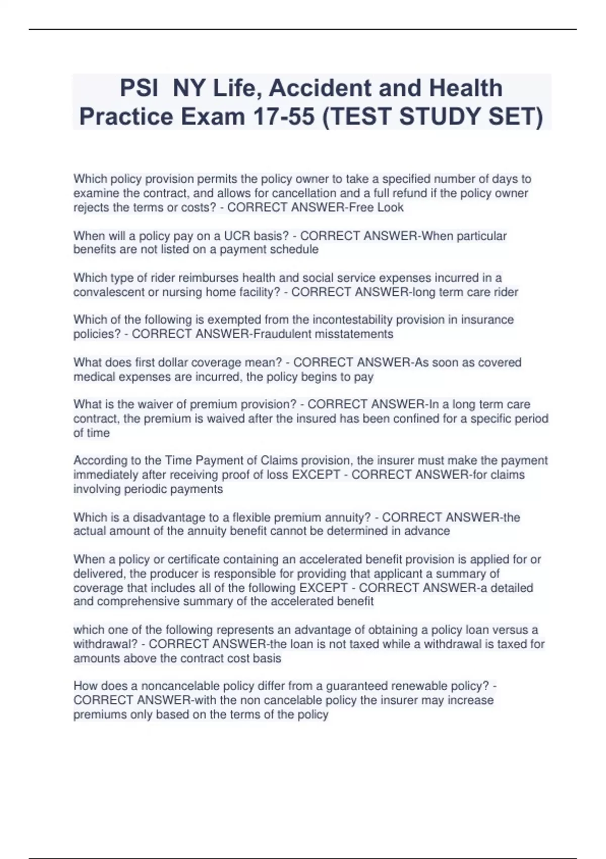 PSI NY Life, Accident and Health Practice Exam 17-55 (TEST STUDY SET) Which policy provision permits the policy owner to take a specified number of days to examine the contract, and allows for cancellation and a full refund if the policy owner rejects the terms or costs? - CORRECT ANSWER-Free Look When will a policy pay on a UCR basis? - CORRECT ANSWER-When particular benefits are not listed on a payment schedule Which type of rider reimburses health and social service expenses incurred in a convalescent or nursing home facility? - CORRECT ANSWER-long term care rider Which of the following is exempted from the incontestability provision in insurance policies? - CORRECT ANSWER-Fraudulent misstatements What does first dollar coverage mean? - CORRECT ANSWER-As soon as covered medical expenses are incurred, the policy begins to pay What is the waiver of premium provision? - CORRECT ANSWER-In a long term care contract, the premium is waived after the insured has been confined for a specific period of time According to the Time Payment of Claims provision, the insurer must make the payment immediately after receiving proof of loss EXCEPT - CORRECT ANSWER-for claims involving periodic payments Which is a disadvantage to a flexible premium annuity? - CORRECT ANSWER-the actual amount of the annuity benefit cannot be determined in advance When a policy or certificate containing an accelerated benefit provision is applied for or delivered, the producer is responsible for providing that applicant a summary of coverage that includes all of the following EXCEPT - CORRECT ANSWER-a detailed and comprehensive summary of the accelerated benefit which one of the following represents an advantage of obtaining a policy loan versus a withdrawal? - CORRECT ANSWER-the loan is not taxed while a withdrawal is taxed for amounts above the contract cost basis How does a noncancelable policy differ from a guaranteed renewable policy? - CORRECT ANSWER-with the non cancelable policy the insurer may increase premiums only based on the terms of the policy What does it mean if a health policy is conditionally renewable? - CORRECT ANSWERInsurer may elect NOT to renew only under the conditions specified in the policy When the suicide clause is inserted in a life insurance contract, death by suicide is not covered during the policy's initial: - CORRECT ANSWER-2 year period What does coinsurance mean? - CORRECT ANSWER-The insurer and the insured share expenses over the deductible. Which of the following must be given to the insurer within 20 days after occurrence or commencement of any loss covered by the policy, or as soon thereafter as is reasonably possible? - CORRECT ANSWER-Notice of claim The right to change the beneficiary or dispose of the policy or its benefits in any manner one chooses is reserved to the policy owner UNLESS which of the following is true? - CORRECT ANSWER-The policy owner has named an irrevocable beneficiary Which of the following refers to how often a premium is paid? - CORRECT ANSWERMode All of the following are common exclusions from loss found in disability income policies EXCEPT for that incurred while - CORRECT ANSWER-Committing a misdemeanor At which point are contractual death benefit settlement options determined and by whom are they determined? - CORRECT ANSWER-At the time the policy is purchased by the owner of the policy All of the following are ownership rights EXCEPT - CORRECT ANSWER-Switching the policy from one insured to another All of the following are TRUE regarding incomplete applications EXCEPT - CORRECT ANSWER-The incomplete application can be accepted with the missing information added later A consumer report used to determine eligibility for insurance may include all of the following EXCEPT - CORRECT ANSWER-Medical underwriting exam All of the following are required signatures on a life insurance application EXCEPT - CORRECT ANSWER-The minor in a juvenile policy Why are insurance policies considered conditional contracts? - CORRECT ANSWERCertain conditions need to be met to make the contract legally enforceable. When does insurable interest come into play in a life insurance policy? - CORRECT ANSWER-when the applicant for the policy is not the insured