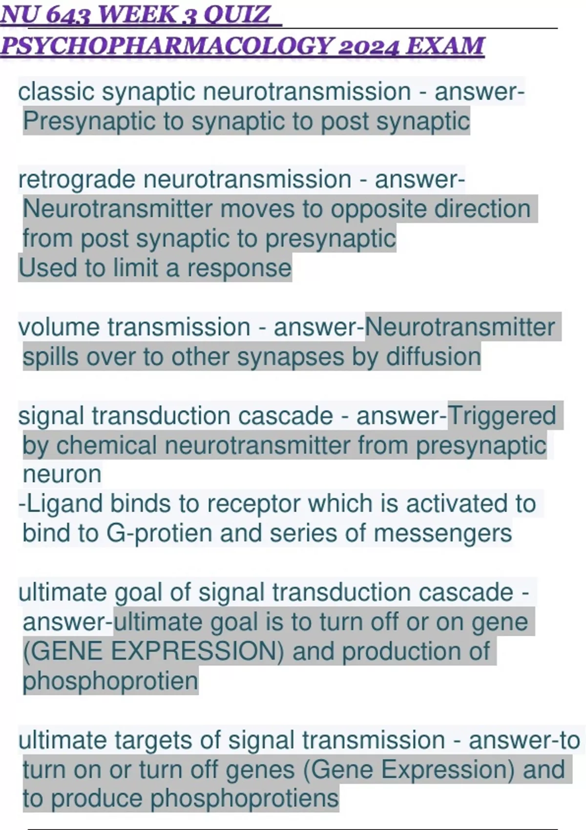 NU 643 WEEK 3 QUIZ PSYCHOPHARMACOLOGY 2024 EXAM