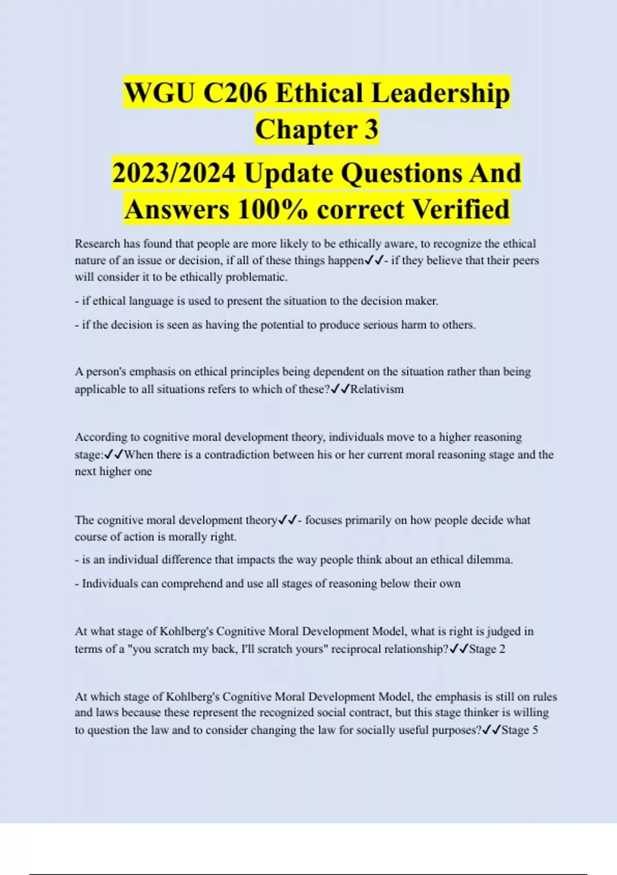 WGU C206 Ethical Leadership Chapter 3 2023/2024 Update Questions And Answers 100% correct Verified