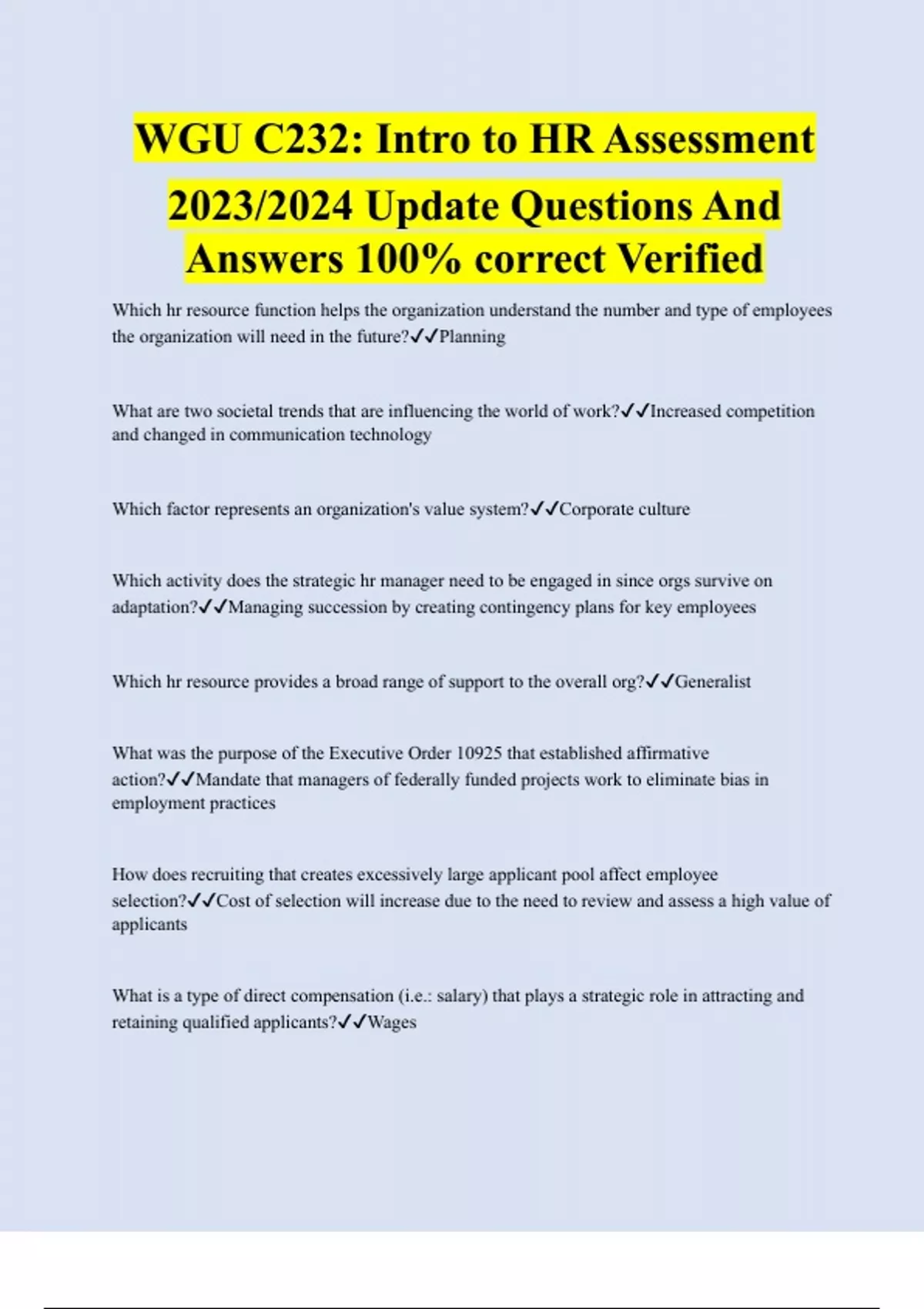 WGU C232: Intro to HR Assessment 2023/2024 Update Questions And Answers 100% correct Verified