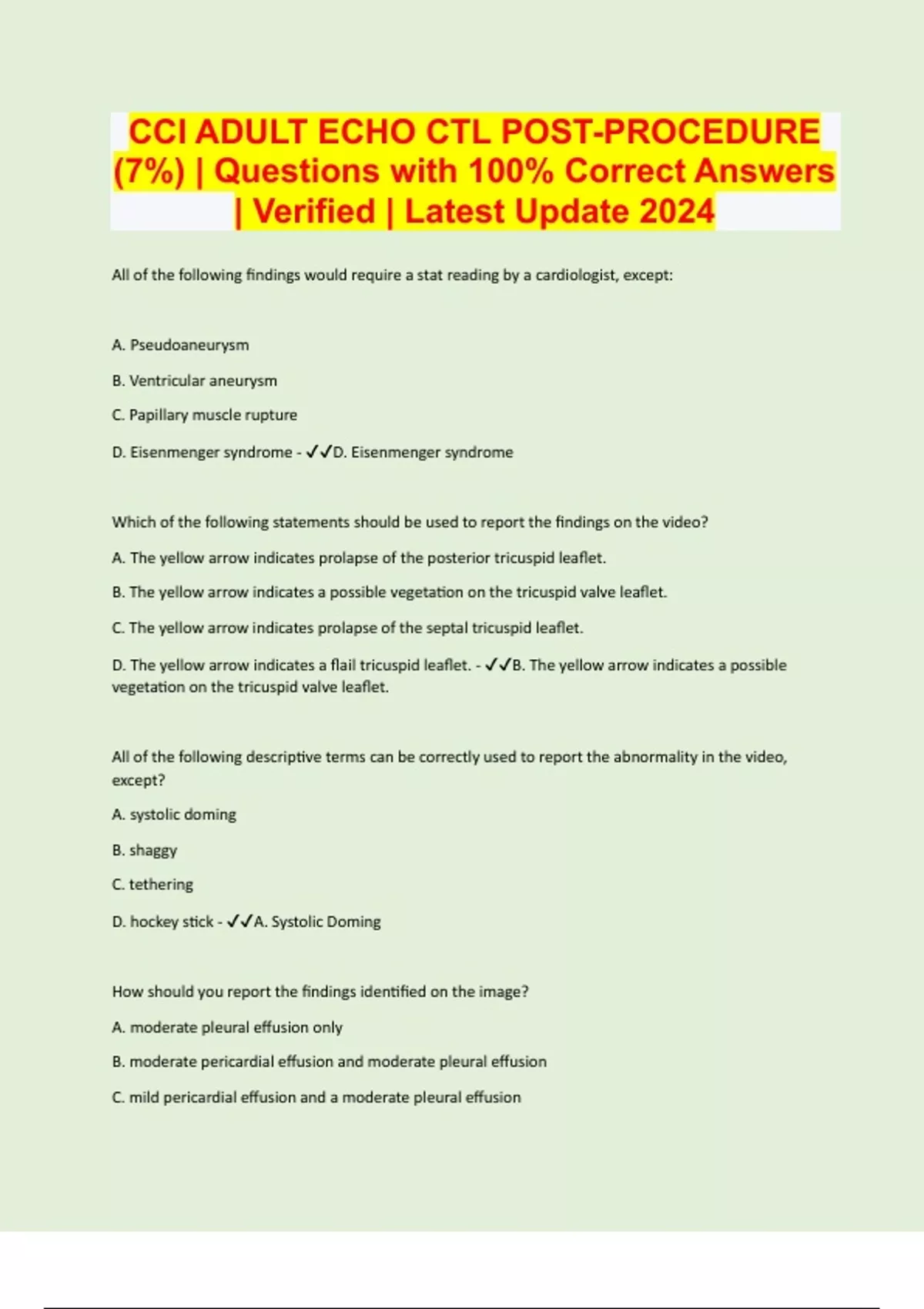 CCI ADULT ECHO CTL POST-PROCEDURE (7%) | Questions with 100% Correct Answers | Verified | Latest Update 2024