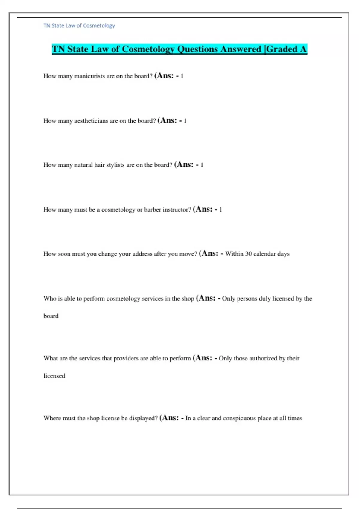 TN State Law of Cosmetology Questions Answered |Graded A