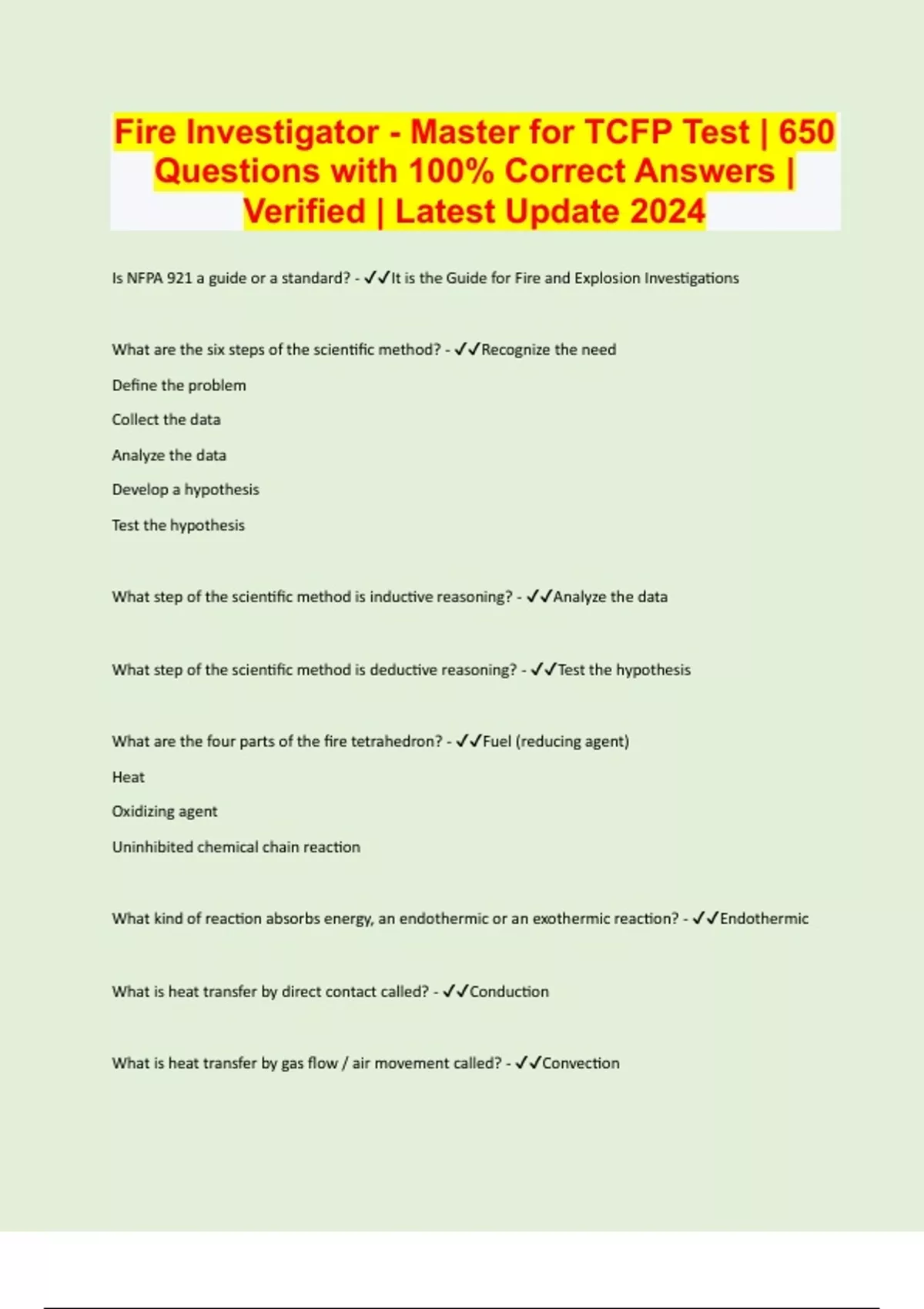 Fire Investigator - Master for TCFP Test | 650 Questions with 100% Correct Answers | Verified | Latest Update 2024